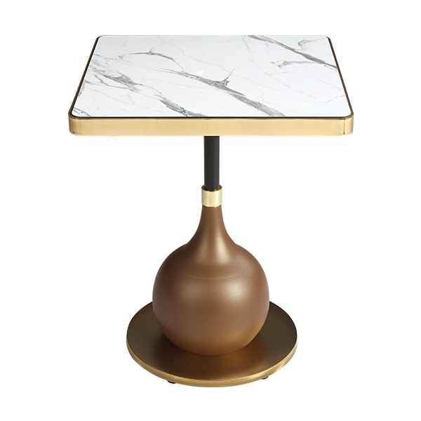 Altın Çerçeveli Beyaz Mermer Kare Masa, beyaz mermer kare tabla ve altın çerçeveli tasarımı ile mekâna lüks bir görünüm katar. Tek ayaklı gövdesi sayesinde sandalyelerle rahat kullanım sağlar. Modern restoran masa modelleri içinde premium bir seçimdir. Kolay temizlenebilir yüzeyi ve dayanıklı metal gövdesi uzun ömürlü kullanım sunar.