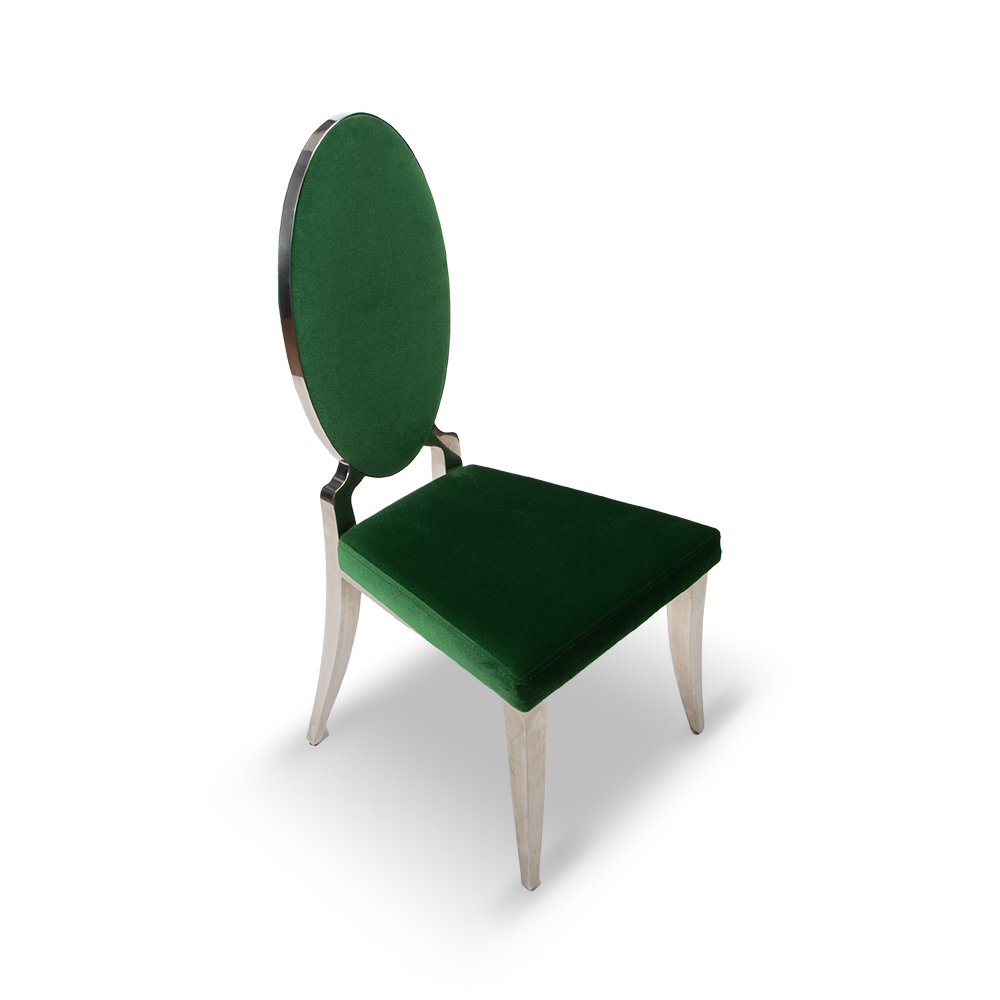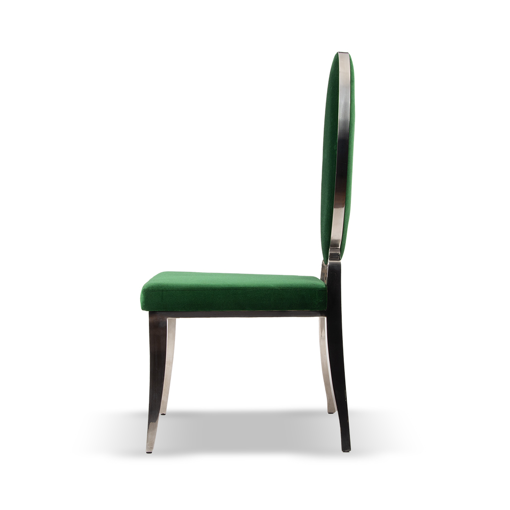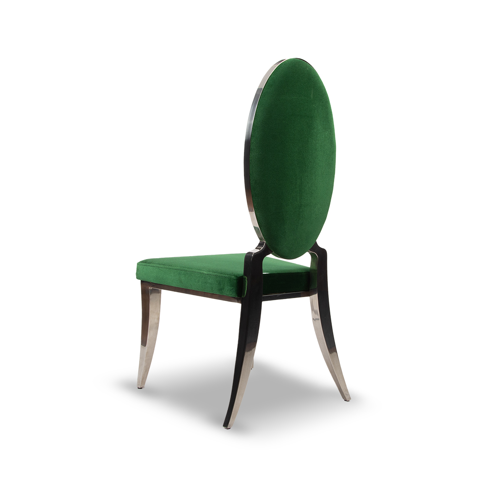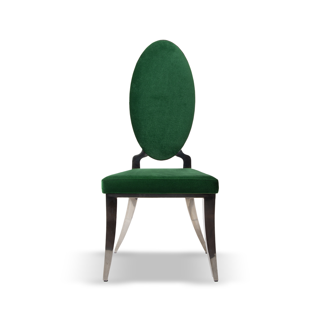 Aris restoran sandalyesi, eliptik sırt tasarımı ve zümrüt yeşili döşemesiyle mekânlara zarif bir duruş kazandırır. Metal ayaklarının kıvrımlı formu, klasik tasarım çizgilerini modern bir yorumla buluşturur.
