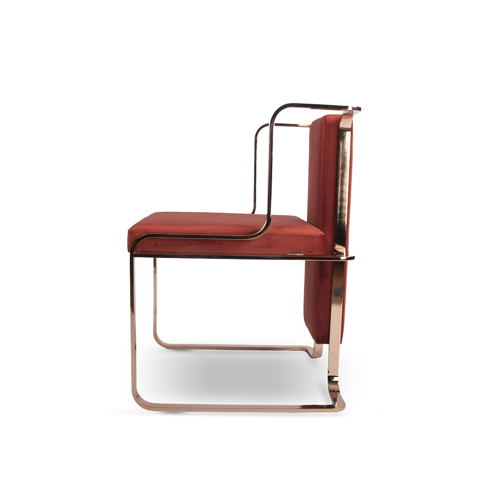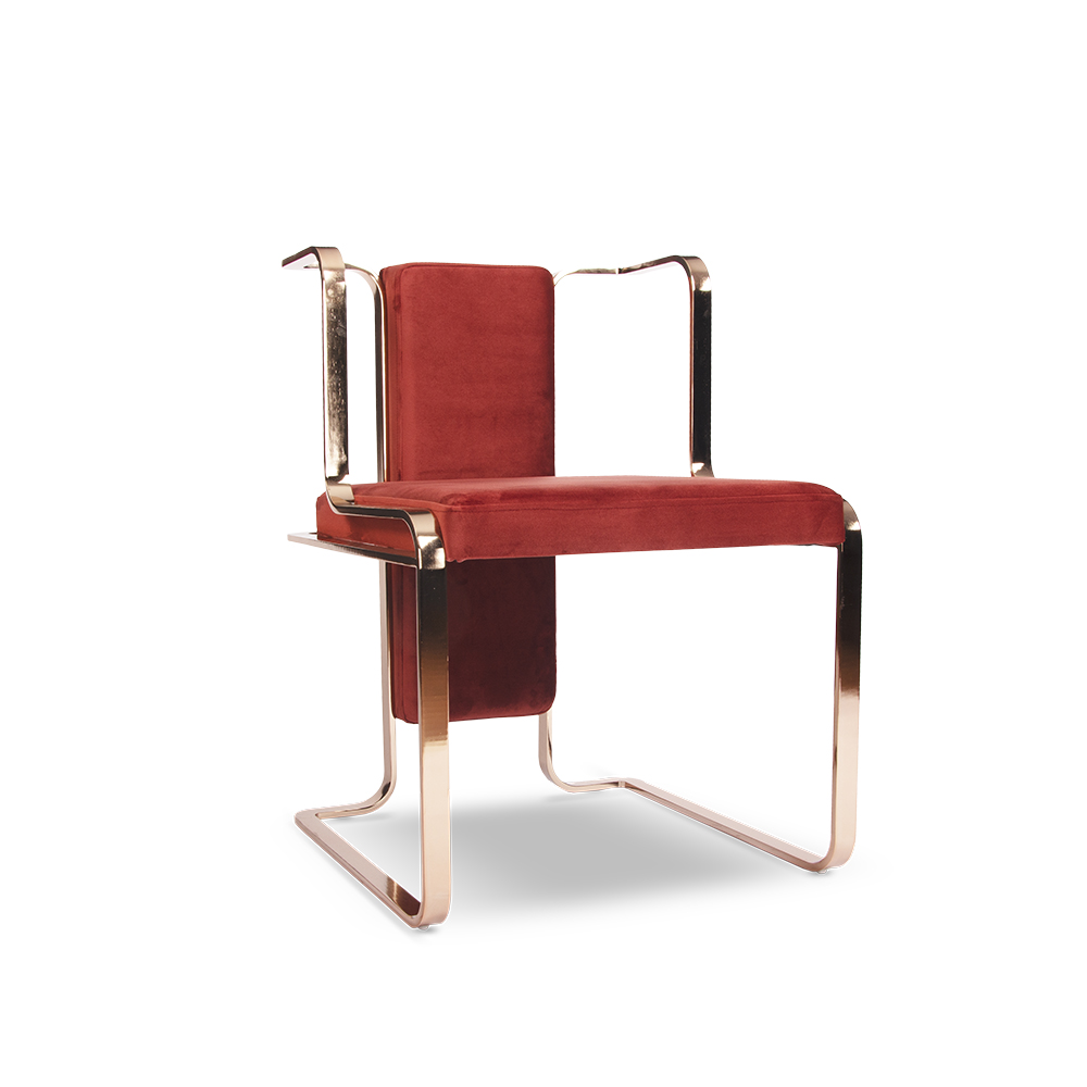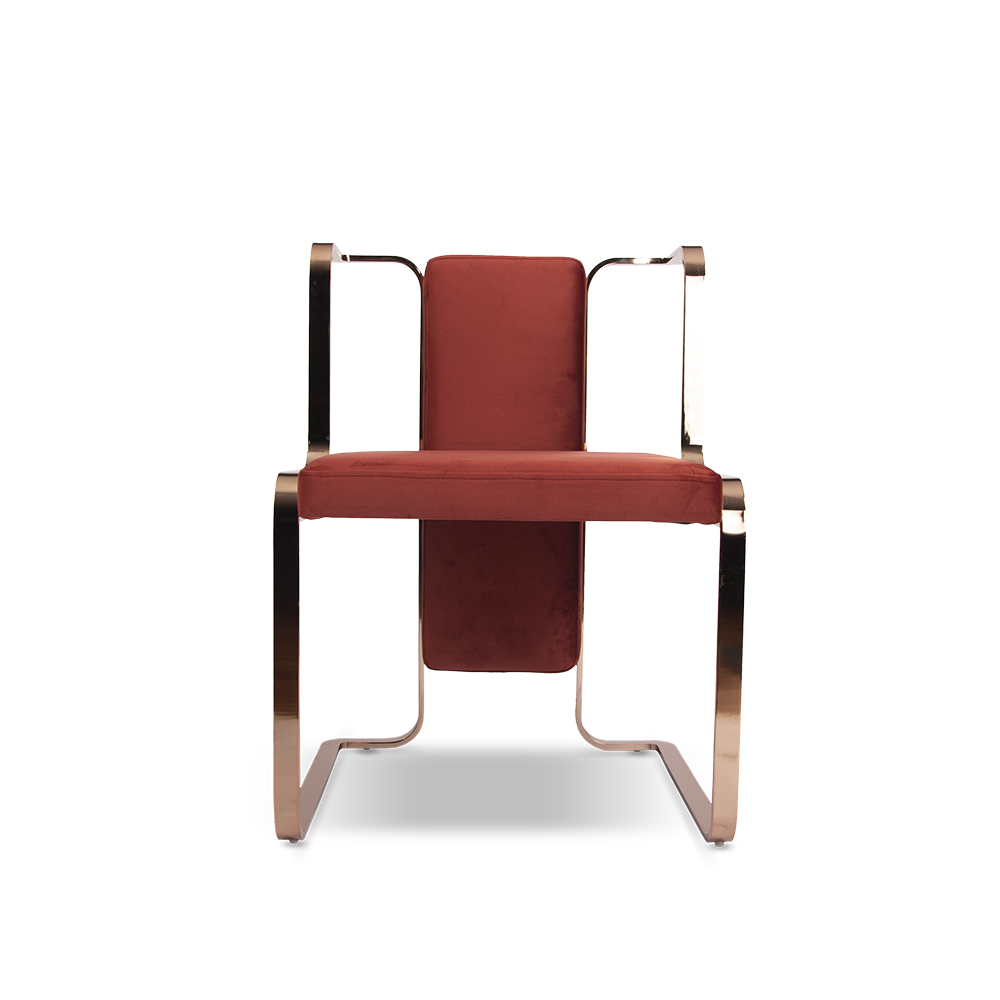 Artemis restoran sandalyesi, modern tasarımın sanatsal bir yorumu olarak öne çıkar. Kavisli metal ayak yapısı ve zarif çizgileriyle mekâna lüks bir dokunuş kazandırırken, bordo kadife döşemesi sıcak ve sofistike bir görünüm sunar. Metal iskeletin parlak yüzeyi, oturum alanının mat dokusuyla kusursuz bir kontrast oluşturur.