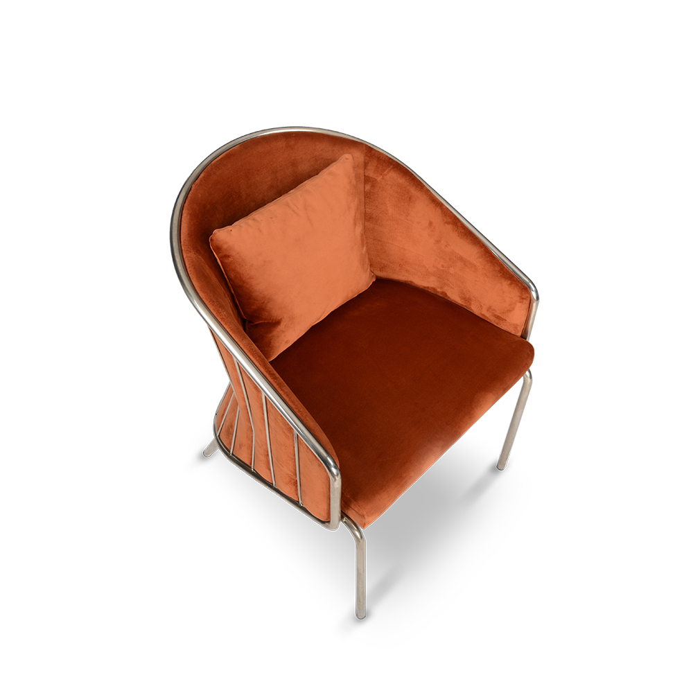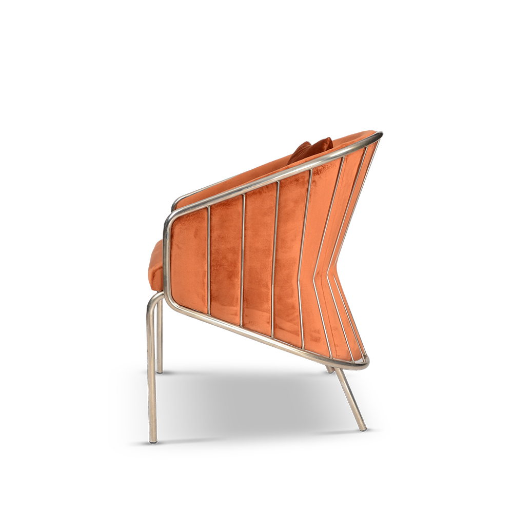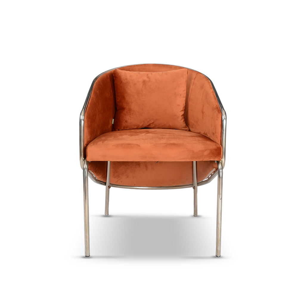 Aurea Metal Çerçeveli Restoran Sandalyesi, geometrik çizgilere sahip zarif tasarımıyla mekânlara sanatsal bir dokunuş kazandırır. Metal hatlarla desteklenen arka formu, turuncu kadife döşemesiyle birleşerek hem çağdaş hem de göz alıcı bir görünüm sunar.