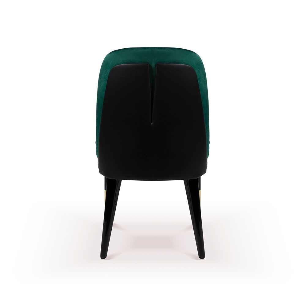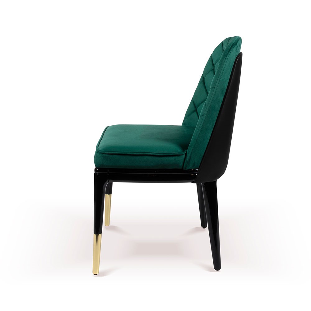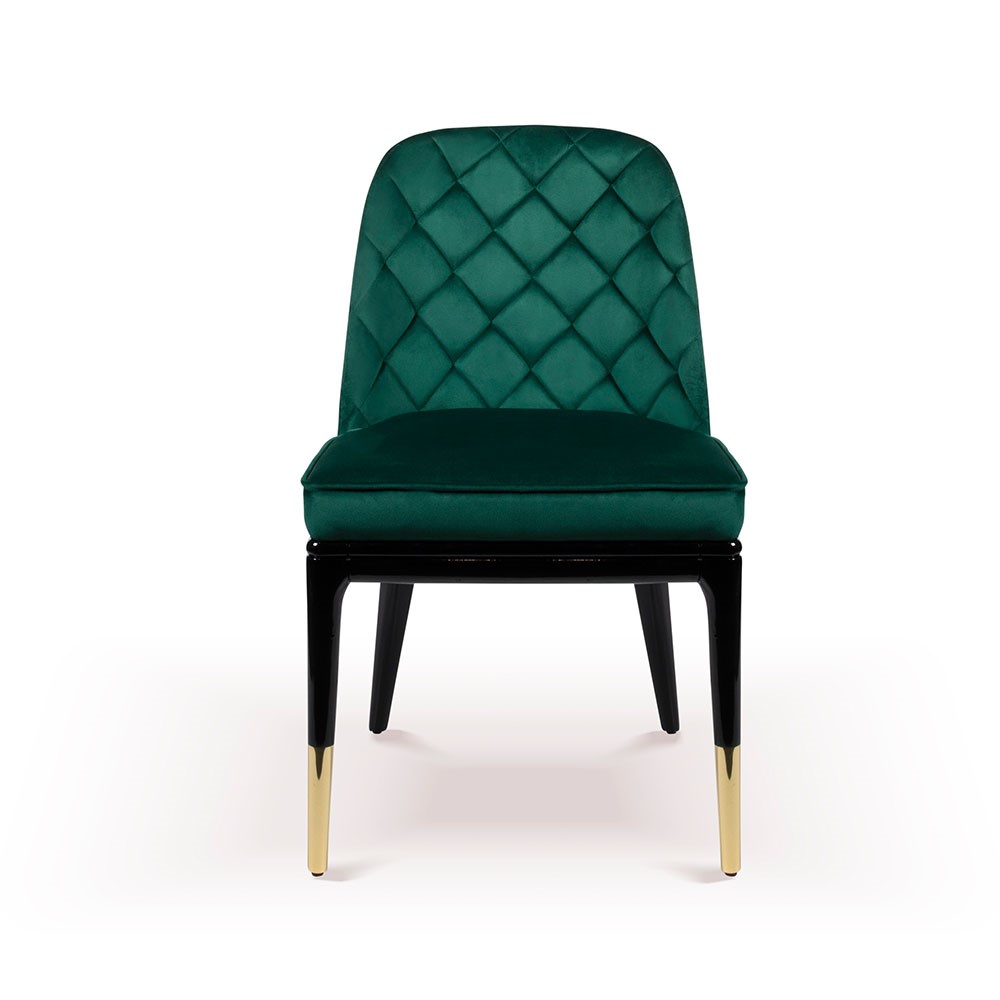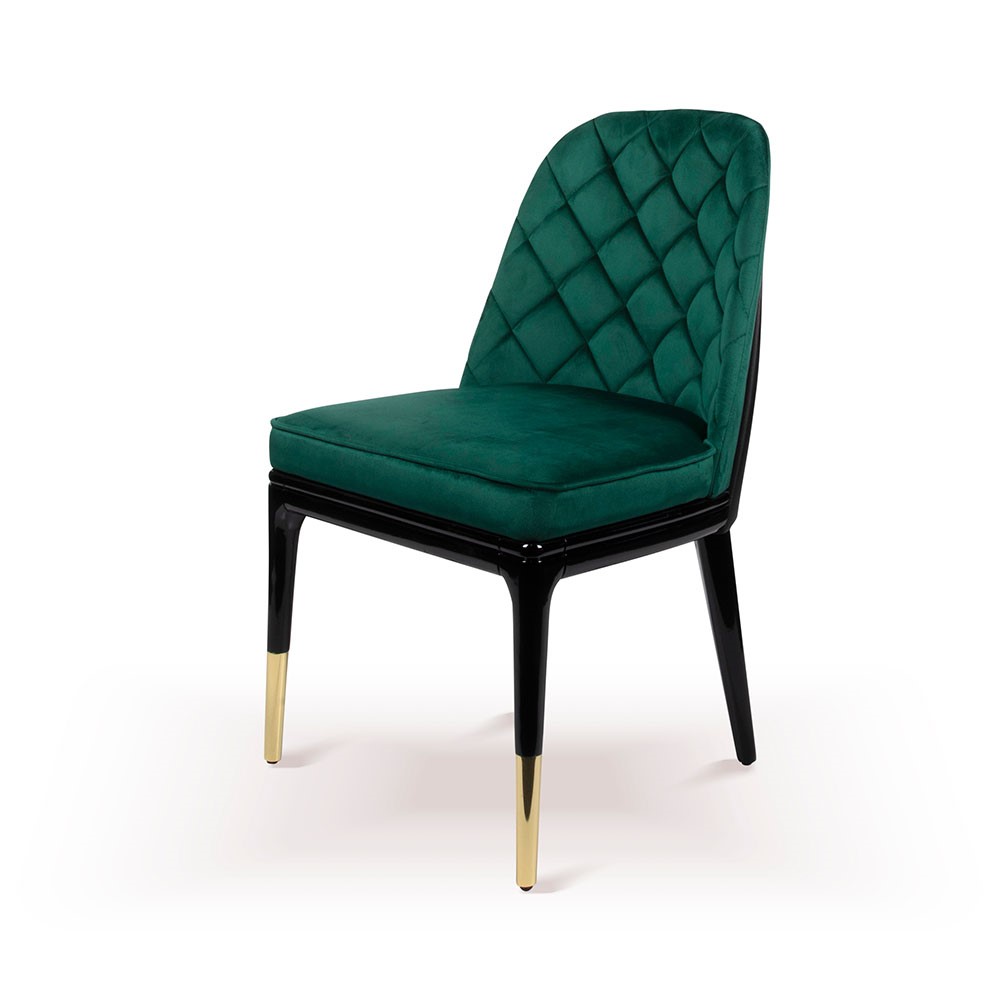 Restoran sandalyesi modelleri arasında zarif detaylarıyla öne çıkan Aurela, zümrüt yeşili kadife döşemesi ve gold uçlu ayak tasarımıyla lüks mekânlara şıklık katar.