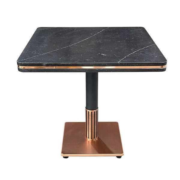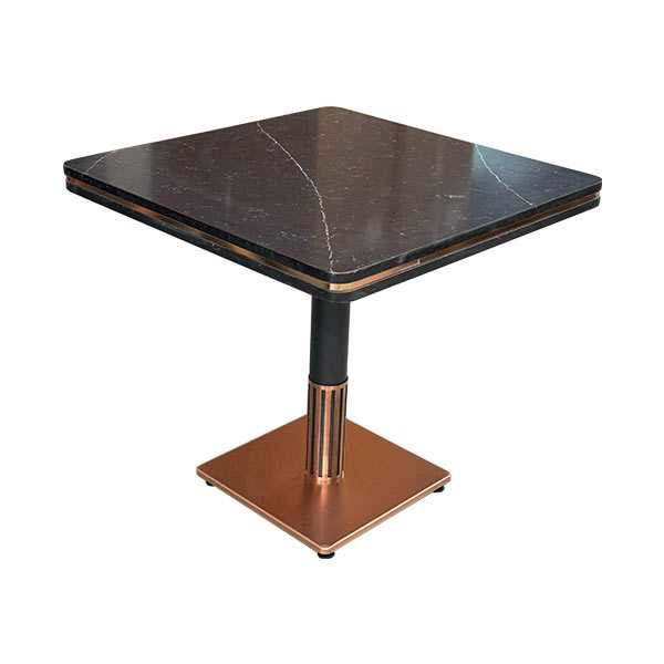 Bakır ayaklı siyah mermer masa – zarif mermer görünümlü kare tablası ve bakır detaylı modern metal ayağı ile restoran ve cafelere şık bir hava katar. Sağlam yapısı uzun ömürlü kullanım sağlar, proje bazlı ölçü seçenekleriyle üretilir ve mekan dekorasyonunu tamamlar.