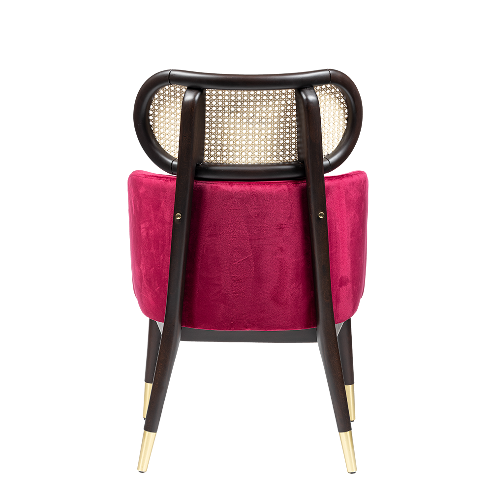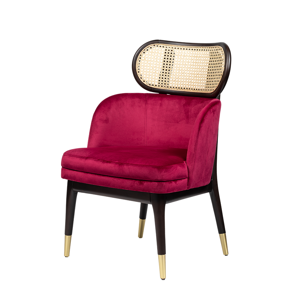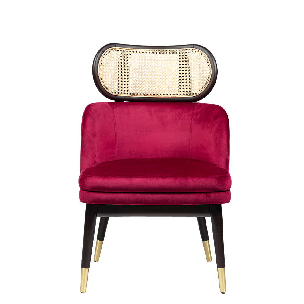 El işçiliği hazeran sırt detayı, bordo kadife döşeme ve gold uçlu siyah ayak yapısı ile mekâna güçlü bir karakter kazandırır.