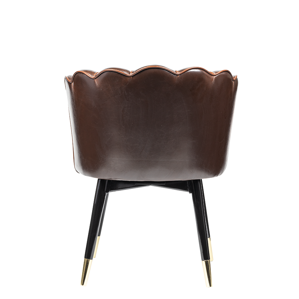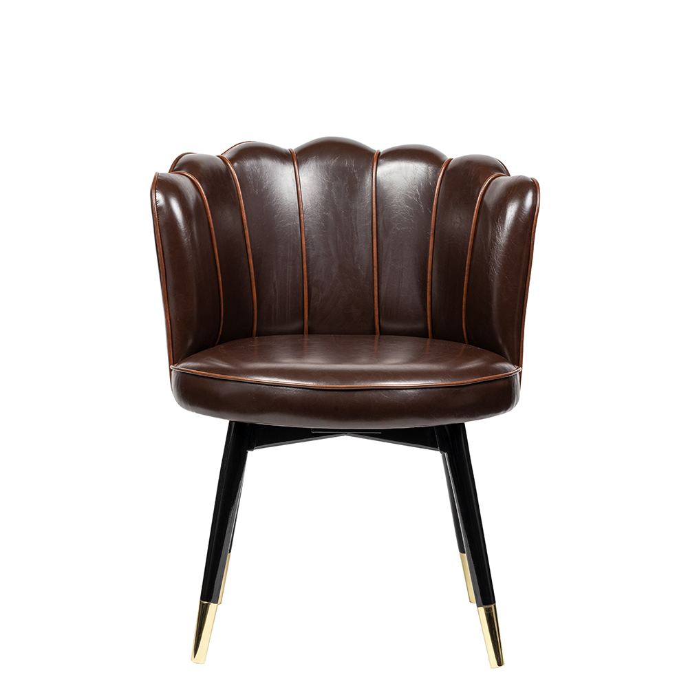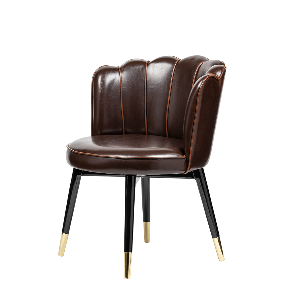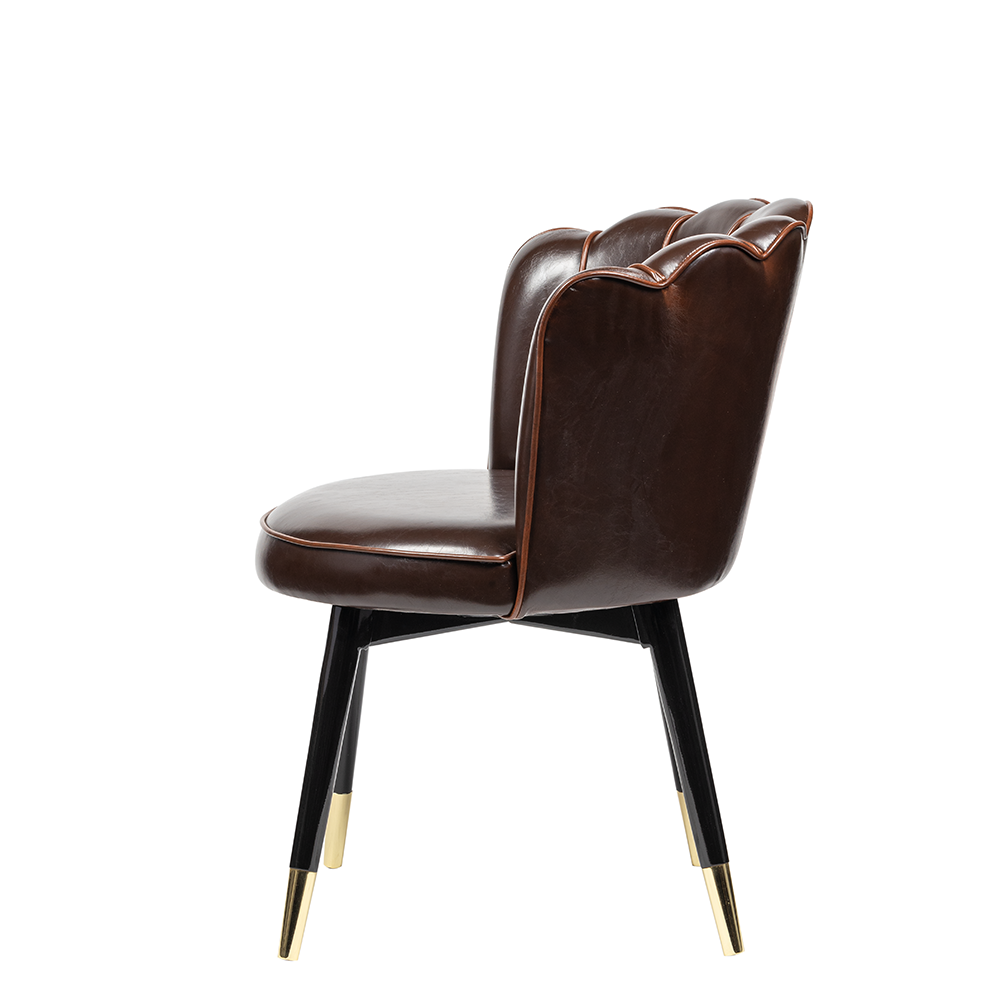Koyu kahve tonundaki deri döşeme, siyah lake ayaklar ve uç kısımlardaki gold detaylar ile zarif bir kontrast sunar.