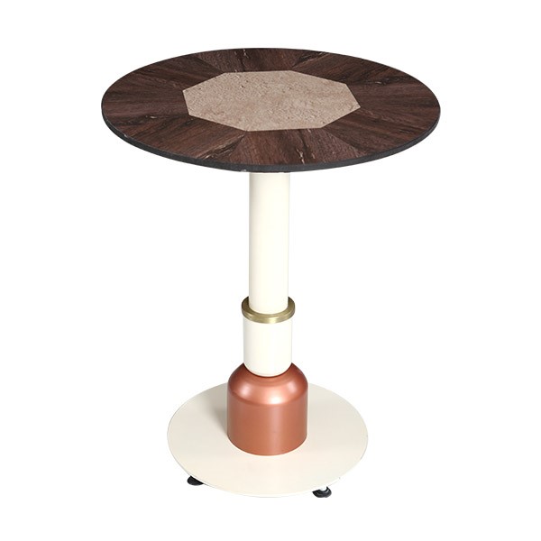 İkili Renk Kombinli Yuvarlak Masa, sekizgen formlu merkez detaya sahip yuvarlak tabla ve bakır + krem renkli metal gövdesi ile farklı ve estetik bir tasarım sunar. Yuvarlak restoran masa modelleri arasında dikkat çeker. Tek ayaklı yapısı oturma düzeninde kolaylık sağlarken, dayanıklı malzeme yapısı uzun ömürlü kullanım sunar.