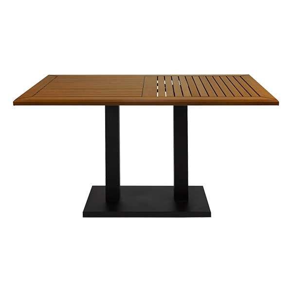 İreko ahşap dikdörtgen masa – doğal iroko lamel tablası ve siyah çift metal ayağıyla dayanıklı bir kullanım sunar. Geniş oturum alanı sayesinde restoran, cafe ve bahçe projelerinde tercih edilir. Dış mekan koşullarına dayanıklı yapısı ile uzun ömürlüdür. Projeye özel ölçülerde üretilebilir.