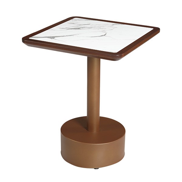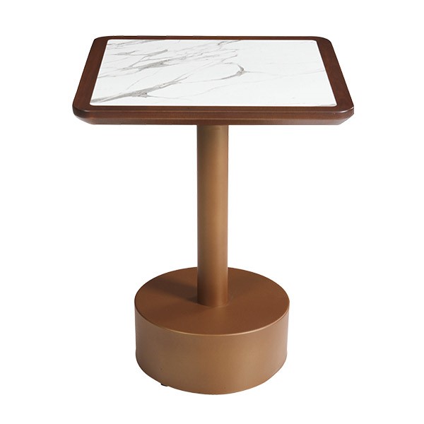 Kahverengi Gövdeli Beyaz Mermer Kare Masa, beyaz mermer görünümlü kare tabla ve kahverengi metal gövdesi ile mekânlara sıcak bir hava katar. Tek ayaklı tasarımı sayesinde konforlu kullanım sunar. Restoran masa modelleri ve cafe masa düzenlemeleri için idealdir. Dayanıklı yapısı uzun ömürlü kullanım sağlar.