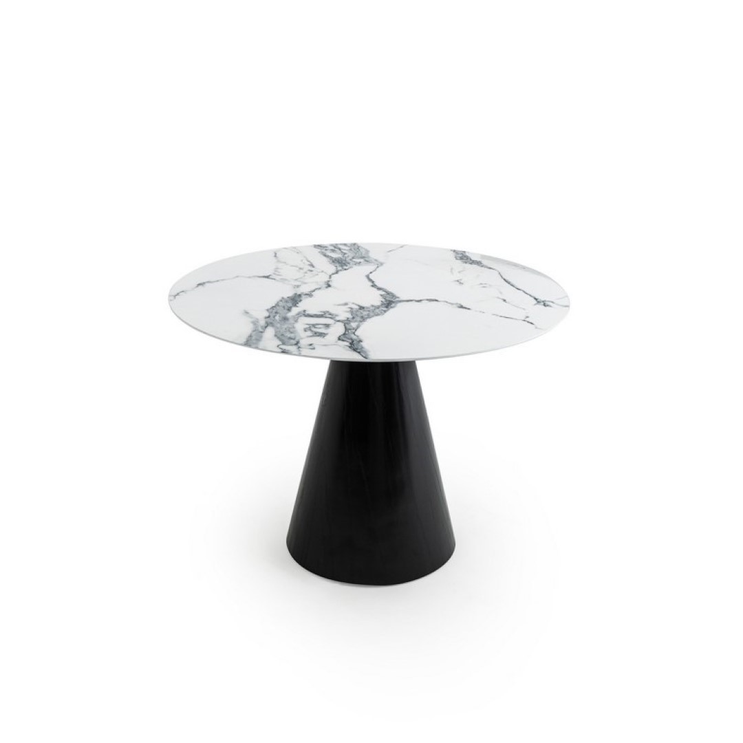 Konik Siyah Gövdeli Yuvarlak Mermer Masa, beyaz mermer görünümlü yuvarlak tabla ve konik siyah gövde ile minimalist ve modern bir görünüm sunar. Restoran masa modelleri ve cafe masa düzenlemeleri için ideal bir seçenektir. Sağlam gövdesi ve kolay temizlenebilir yüzeyi uzun ömürlü kullanım sağlar.