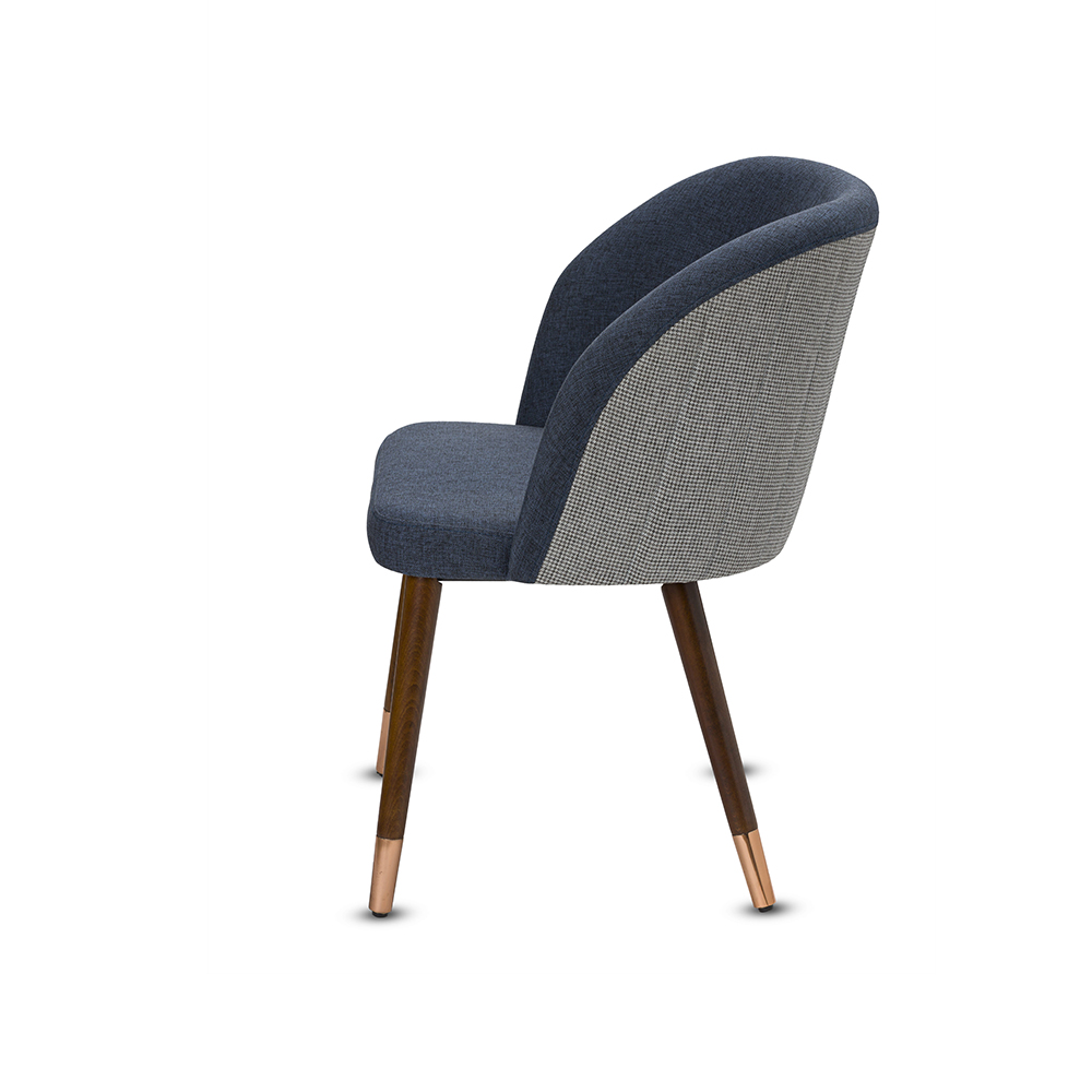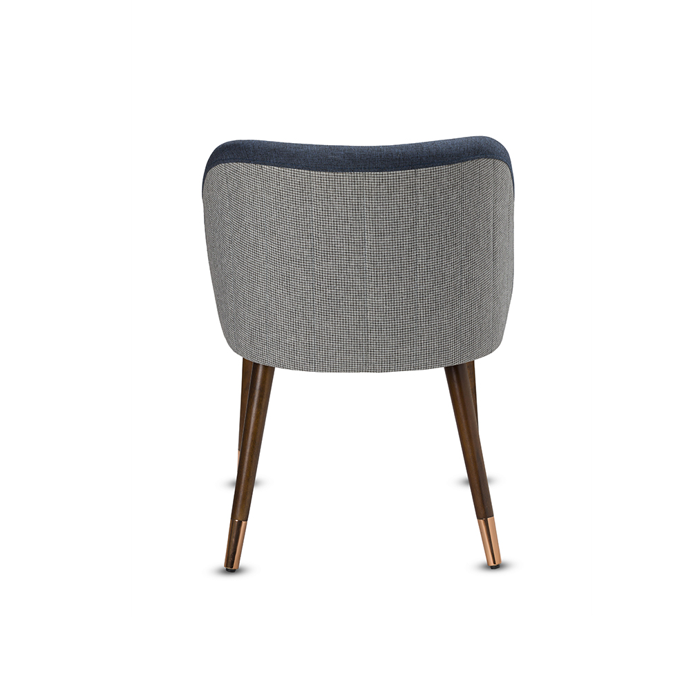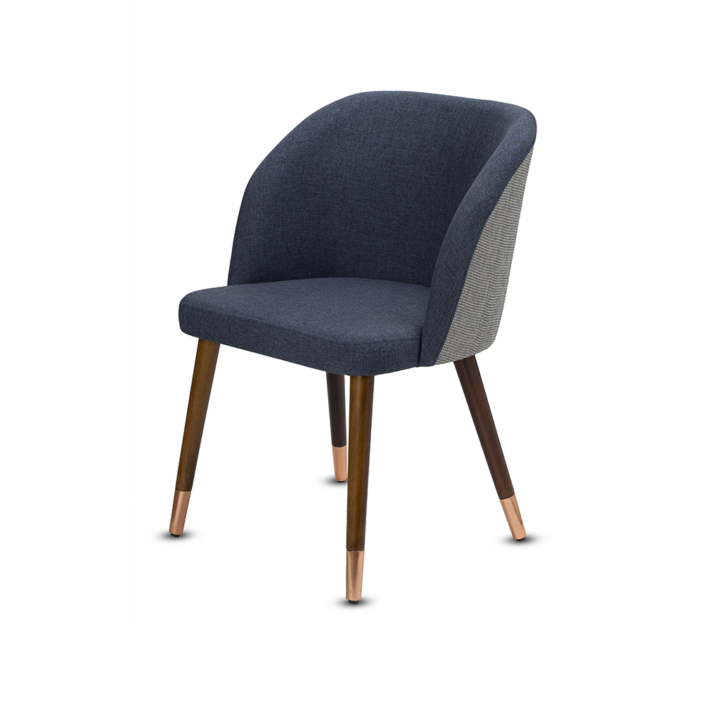 Mavi tonlu kumaş döşemesi, arkadaki dokulu kumaş geçişi ve pirinç uç detaylı ahşap ayaklarıyla estetik bir bütünlük oluşturur.