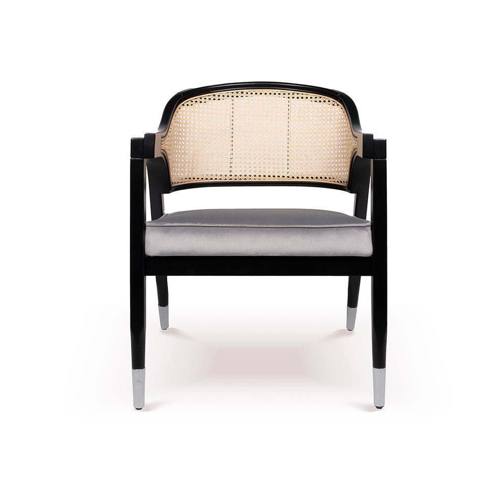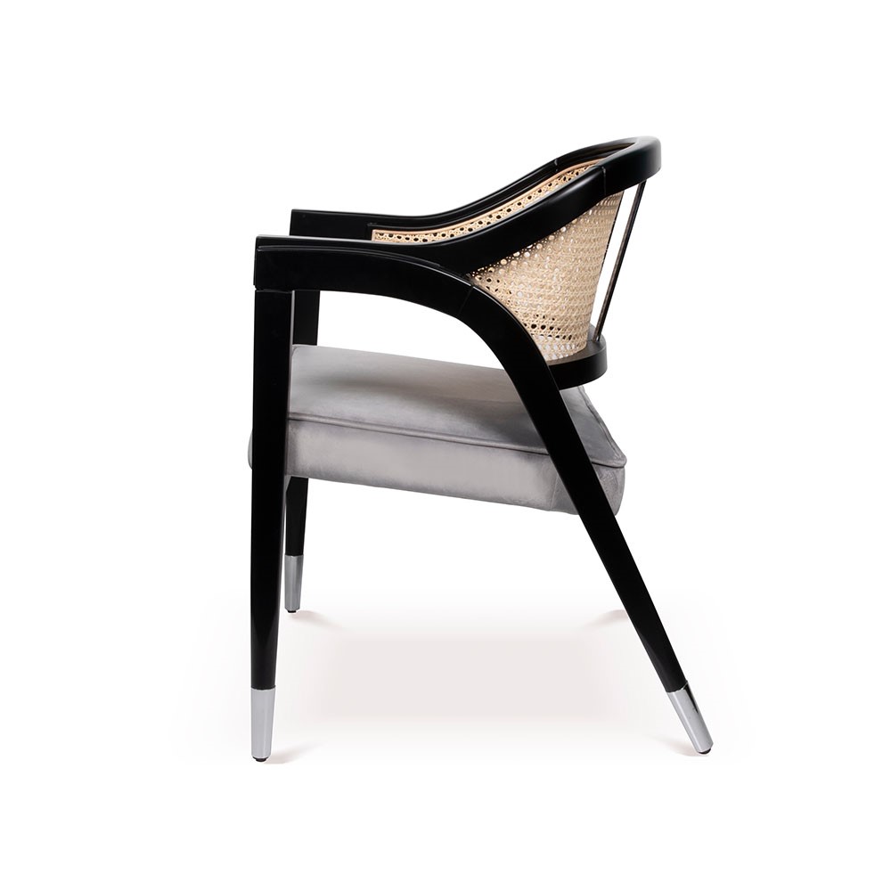 Marenza İç Mekan Sandalyesi, zarif hatları ve lüks detaylarıyla modern iç mekan tasarımlarının en dikkat çekici parçalarından biridir. Siyah lake ahşap gövdesi, el işçiliğiyle örülmüş hazeran sırt detayı ve gümüş tonlu ayak uçlarıyla şıklığı ve zarafeti bir arada sunar. Gri tonlu döşemesiyle mekâna sofistike bir dokunuş kazandırır.