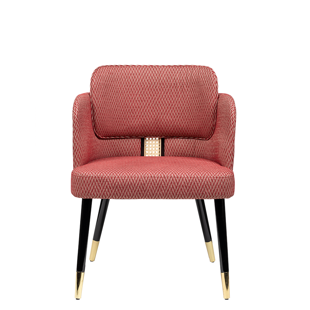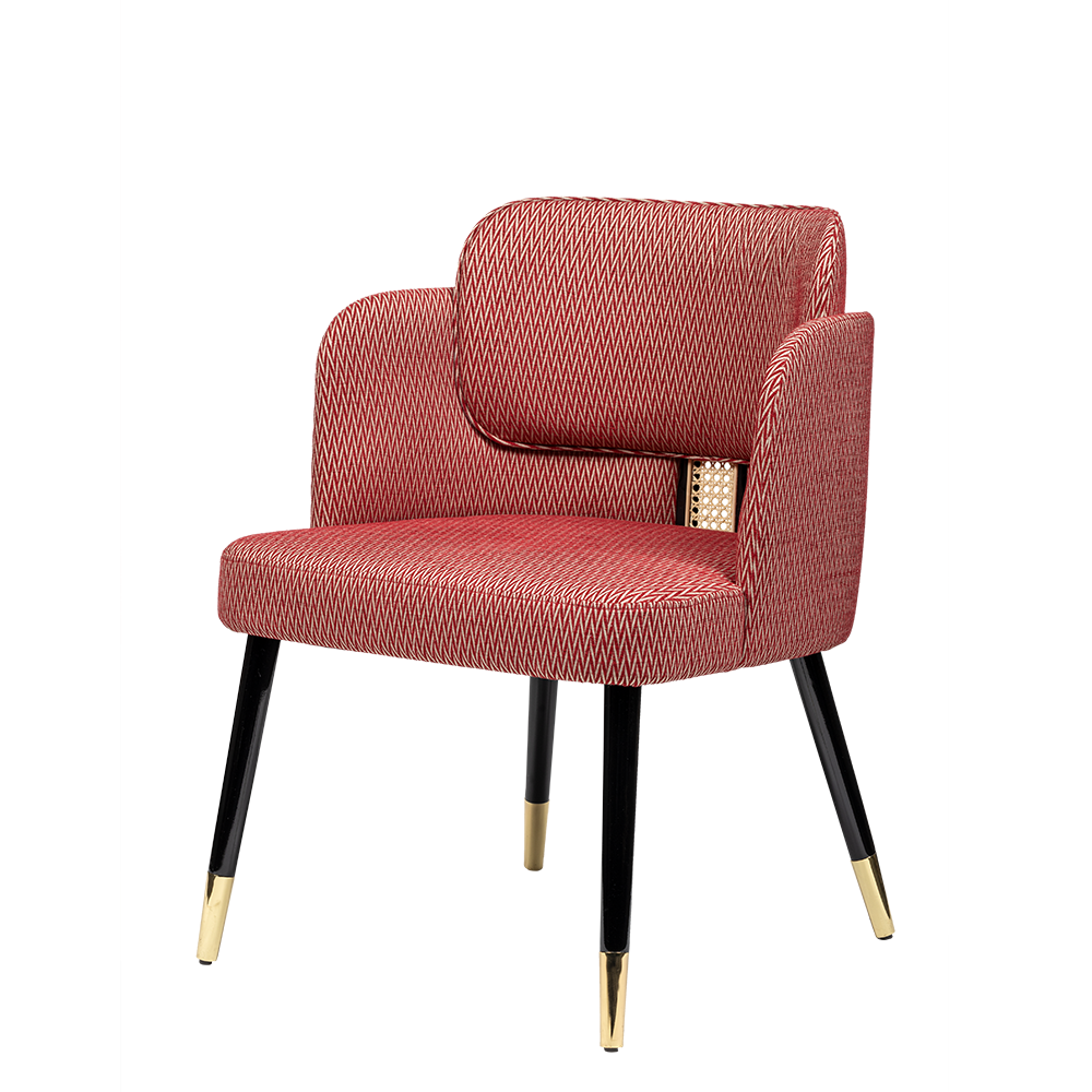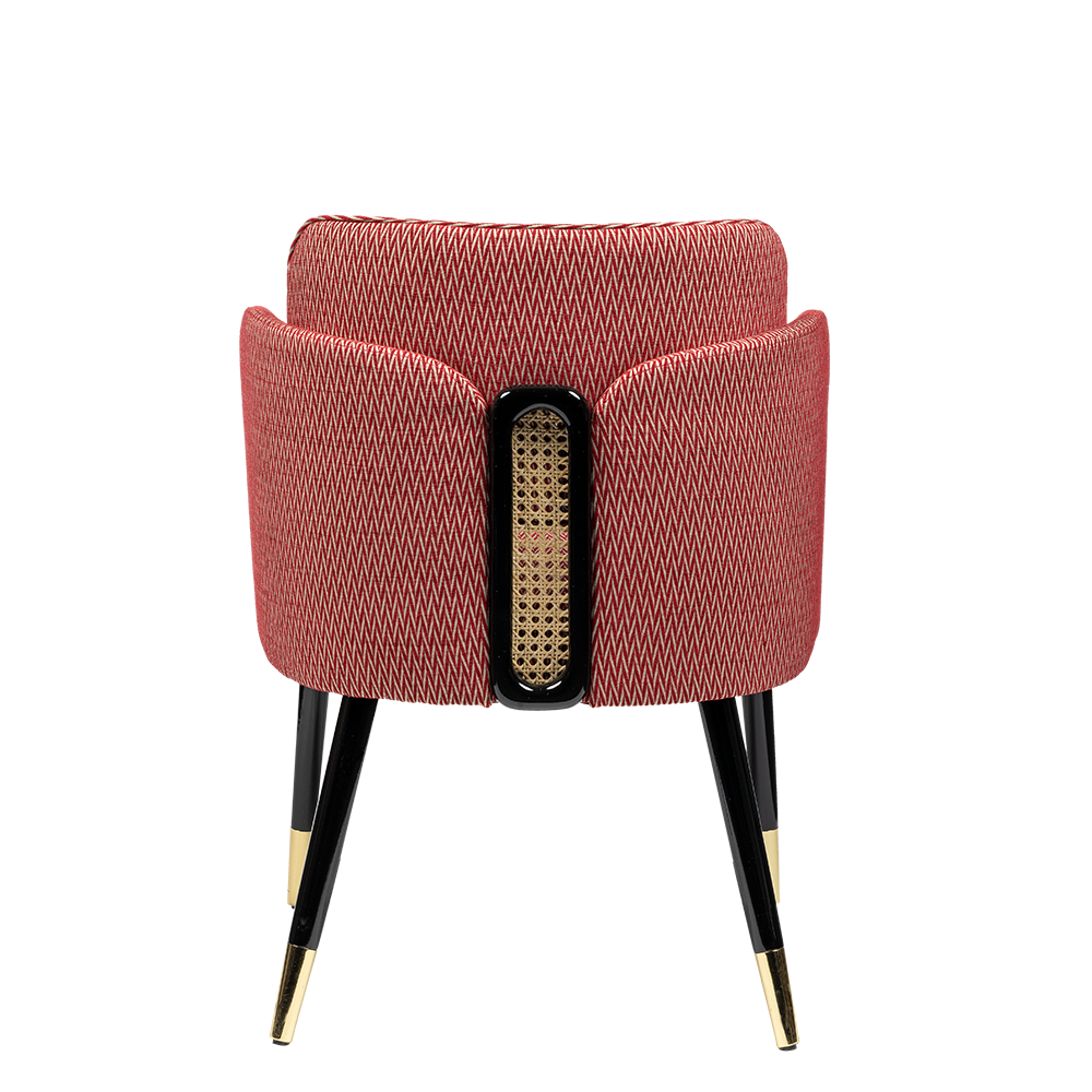 Navia İç Mekan Sandalyesi, modern tasarımı, dikkat çekici renk dokusu ve zarif detaylarıyla iç mekanlara karakter kazandırır. Kırmızı tonlu özel dokuma kumaşı, sırt kısmındaki hazeran detayı ve altın uçlu siyah ayak yapısıyla mekâna enerji ve prestij katar. Cafe, restoran ve otel projelerinde göz alıcı bir atmosfer yaratmak isteyen markalar için tasarlanmıştır.