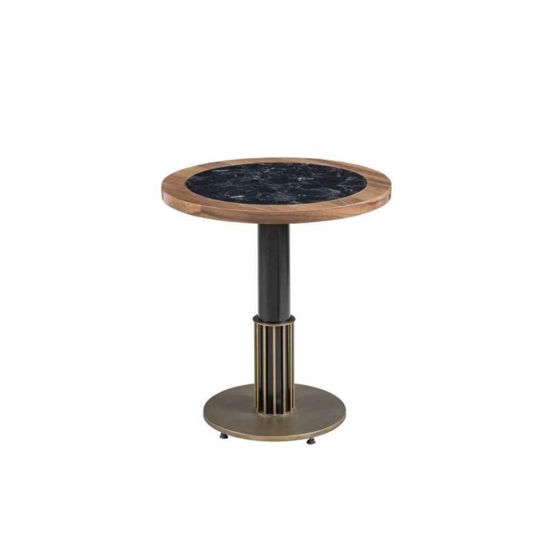 Nero siyah mermer desenli yuvarlak restaurant masası, ahşap çerçevesi ve pirinç detaylı şık ayağıyla modern restoran ve kafe konseptlerine zarif bir dokunuş katar. Yuvarlak masa modelleri kategorisinde şıklığı ve dayanıklılığı bir araya getirir, uzun ömürlü kullanım için idealdir.