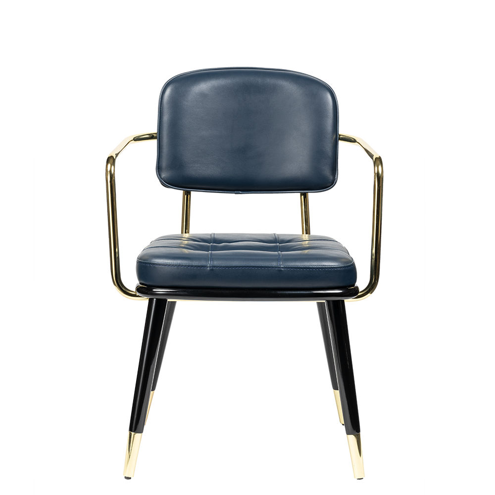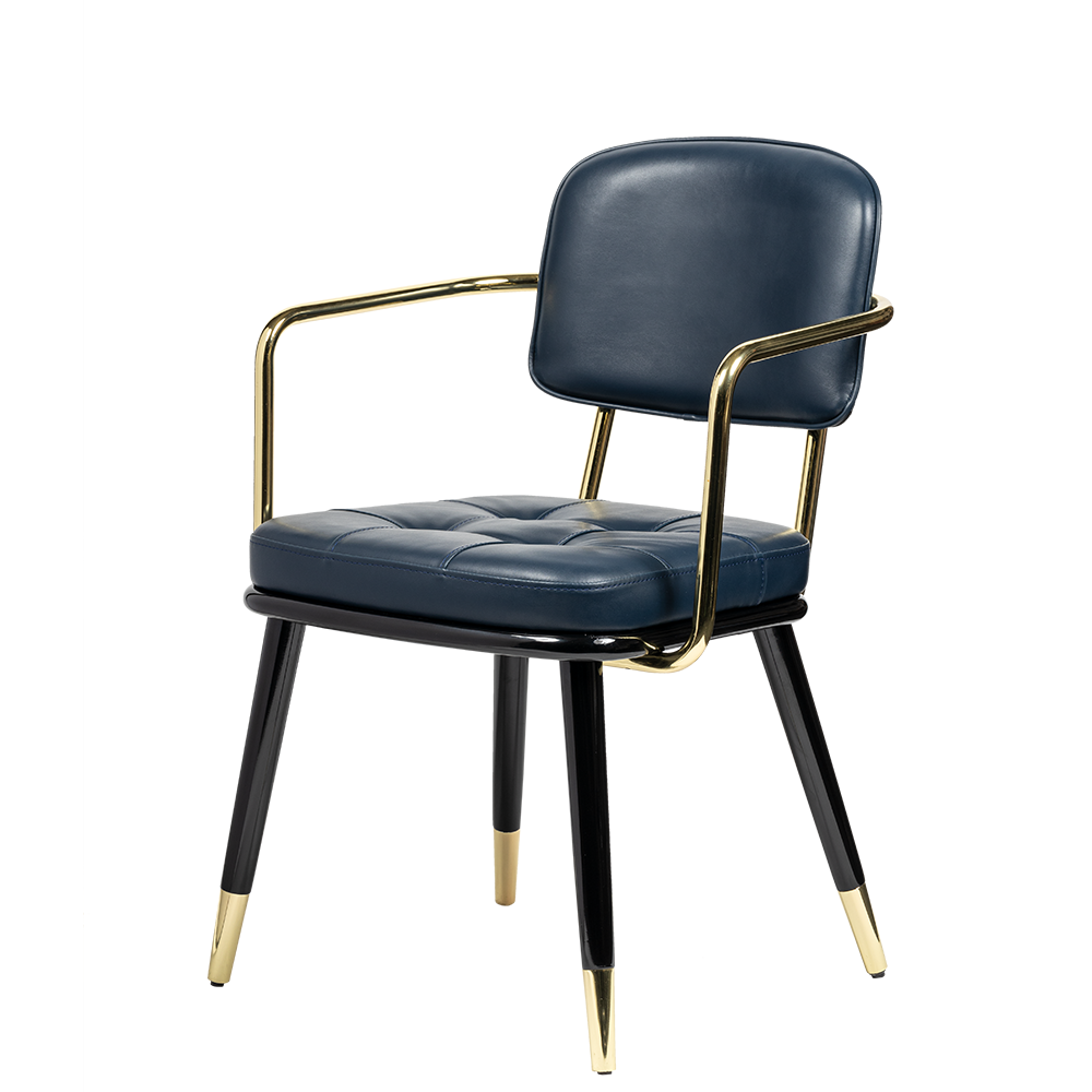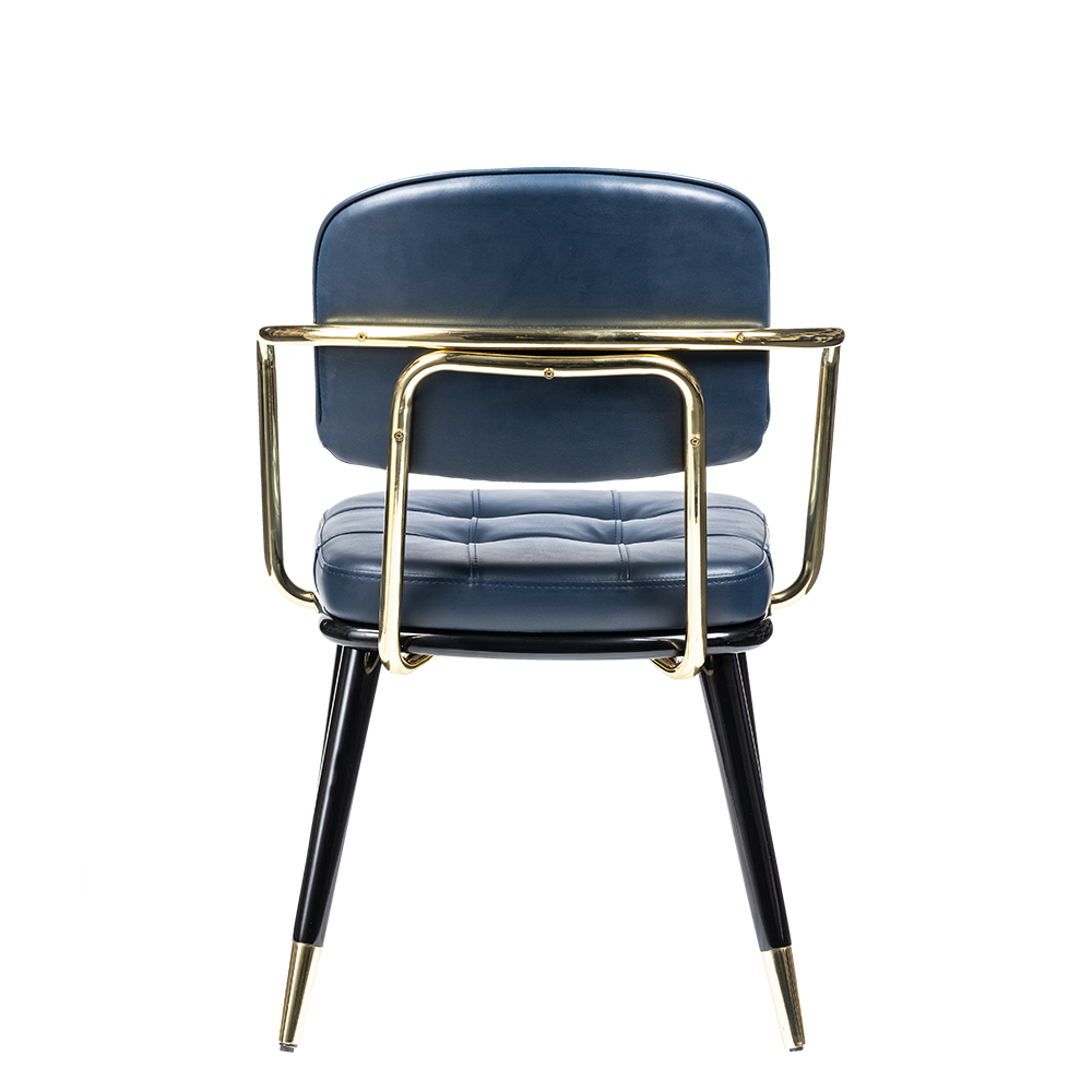 Ravion İç Mekan Sandalyesi, modern ve retro tasarım çizgilerini aynı formda buluşturan şık bir modeldir. Lacivert tonlu deri döşemesi, pirinç metal kolları ve altın detaylı siyah ayaklarıyla her mekâna sofistike bir görünüm kazandırır. Konforlu oturumu ve karakteristik formu sayesinde cafe, restoran ve otel projelerinde öne çıkan bir tercih haline gelir.
