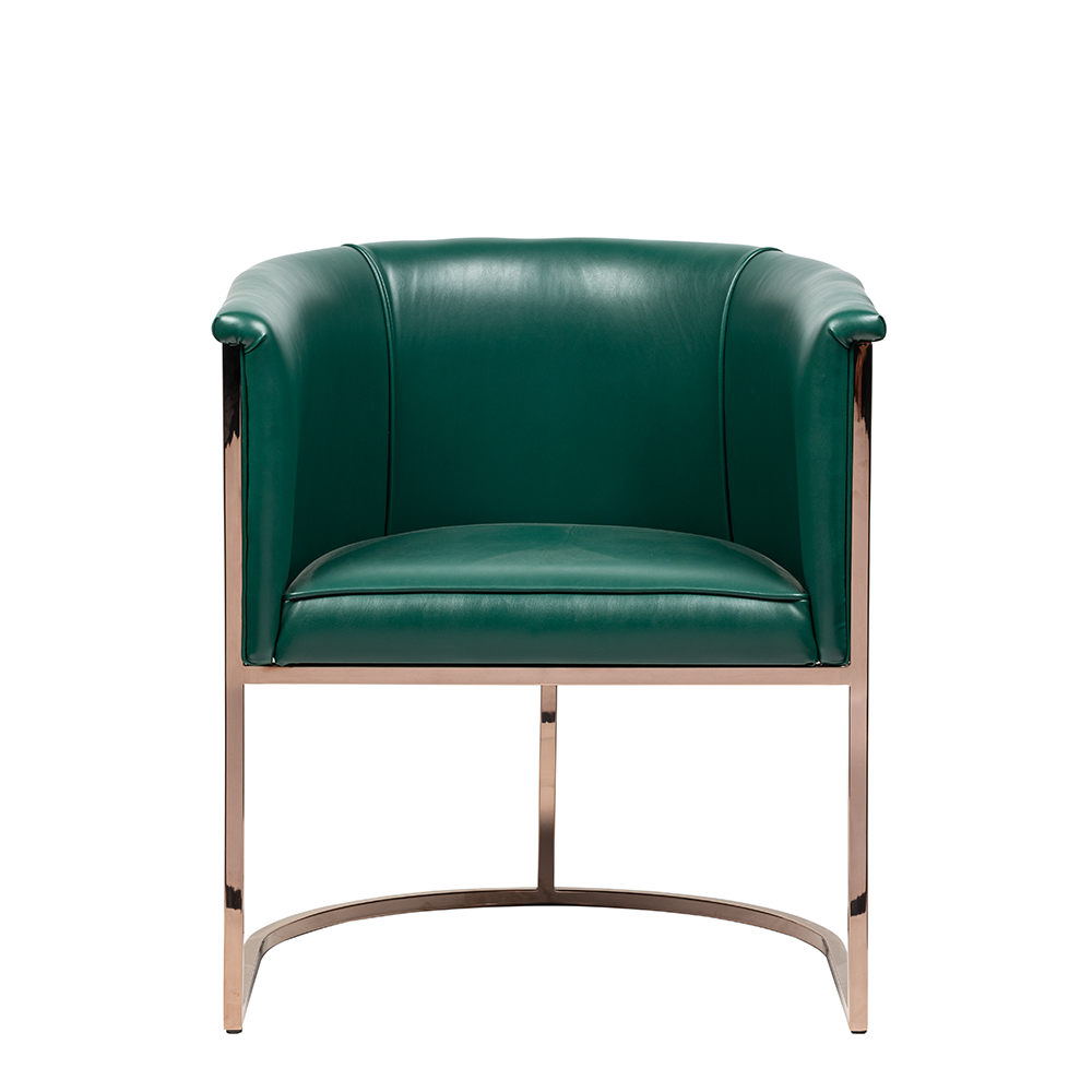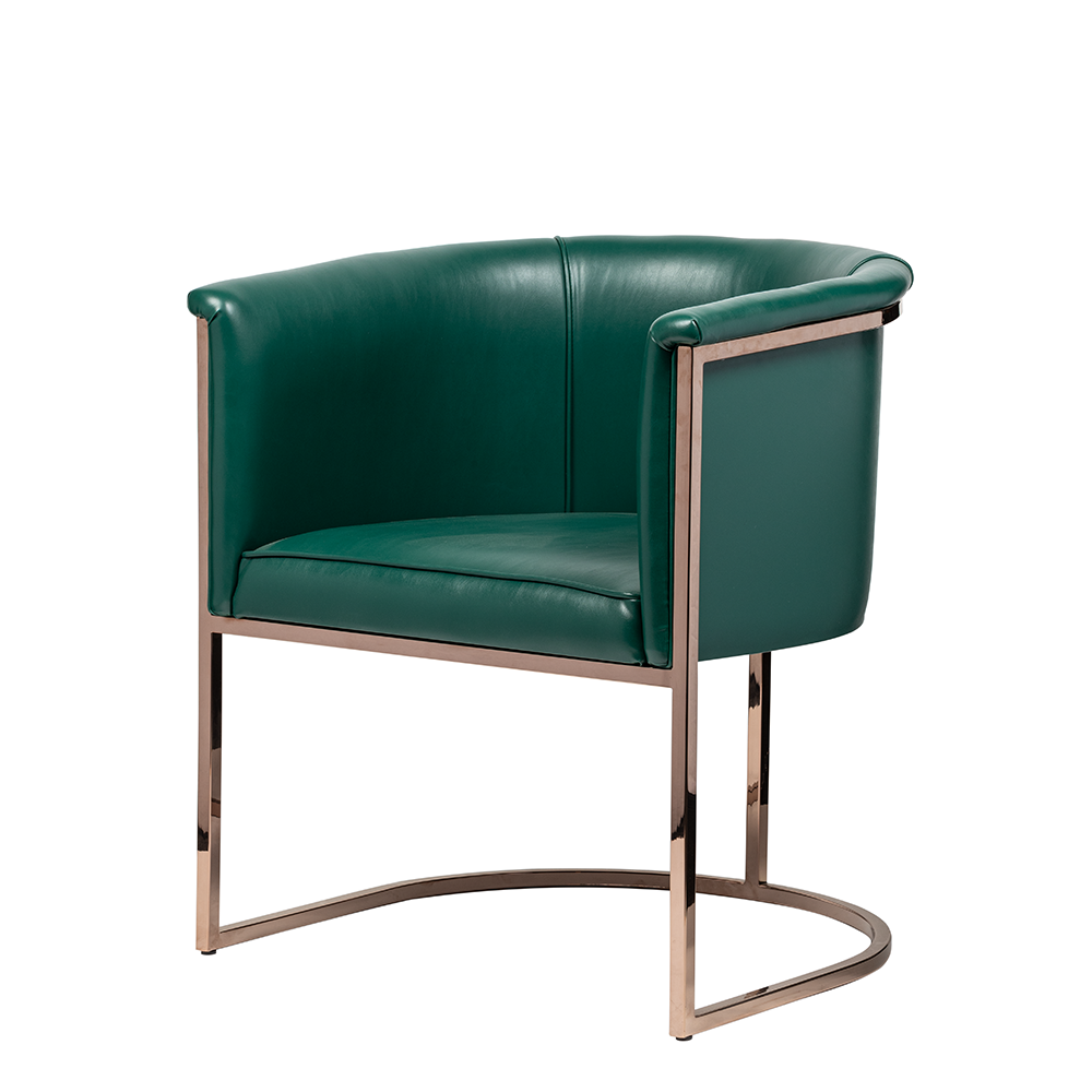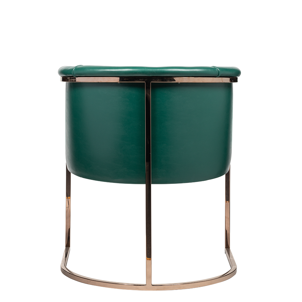 Rose gold metal iskelet, mekâna modern bir ışıltı kazandırırken, yeşil tonun derinliği mekânın enerjisini yükseltir. Model, proje bazlı olarak farklı metal, deri veya kumaş kombinasyonlarıyla kişiselleştirilebilir.