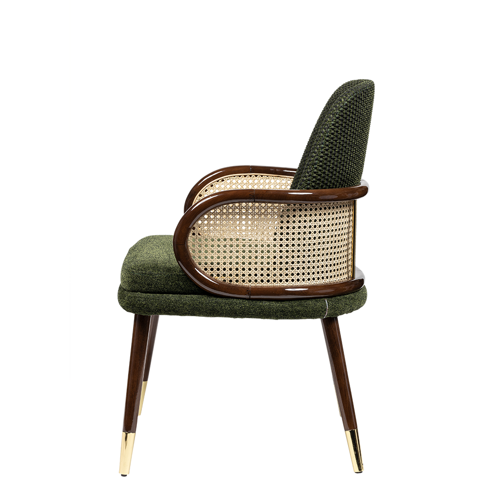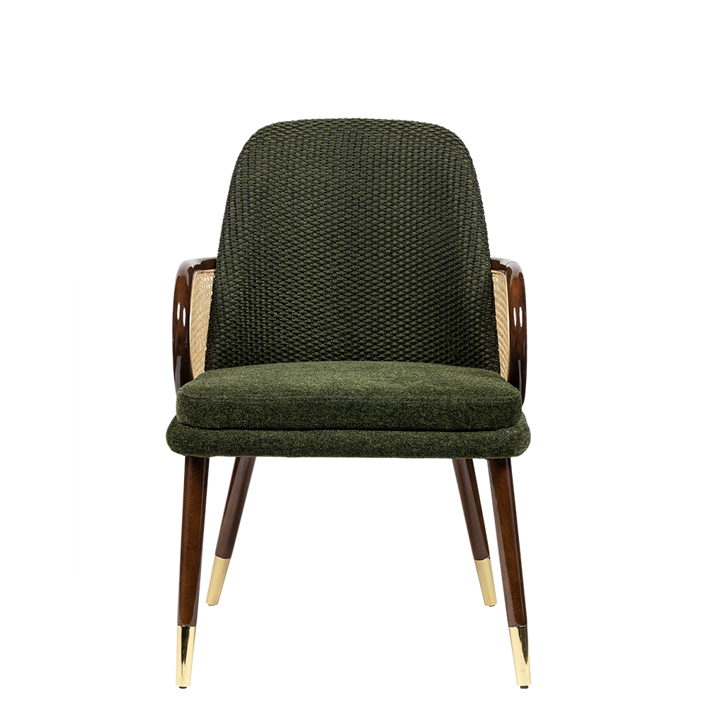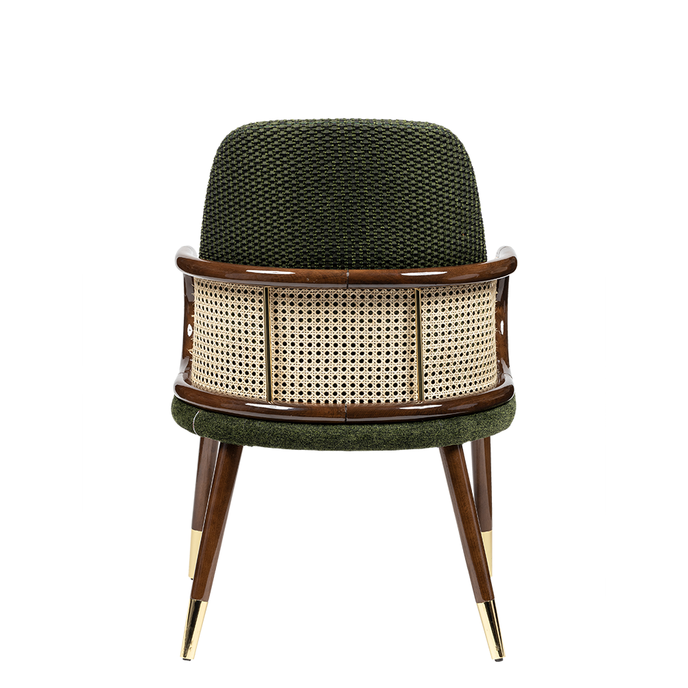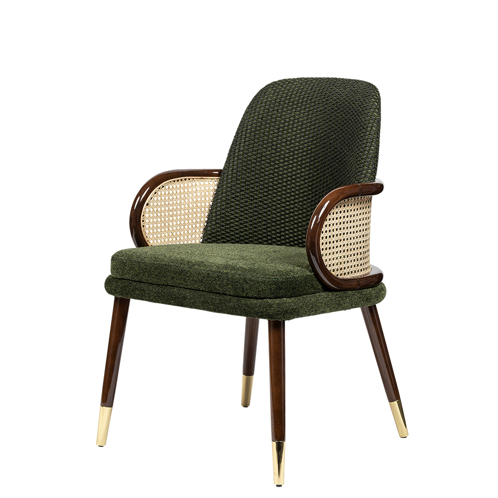 Romeo İç Mekan Sandalyesi, klasik zarafeti modern detaylarla buluşturan özgün bir tasarımdır. Derin yeşil dokulu kumaşı, ceviz ahşap iskeleti, hasır sırt detayı ve gold ayak uçlarıyla iç mekanlara sıcak, doğal ve şık bir hava kazandırır.