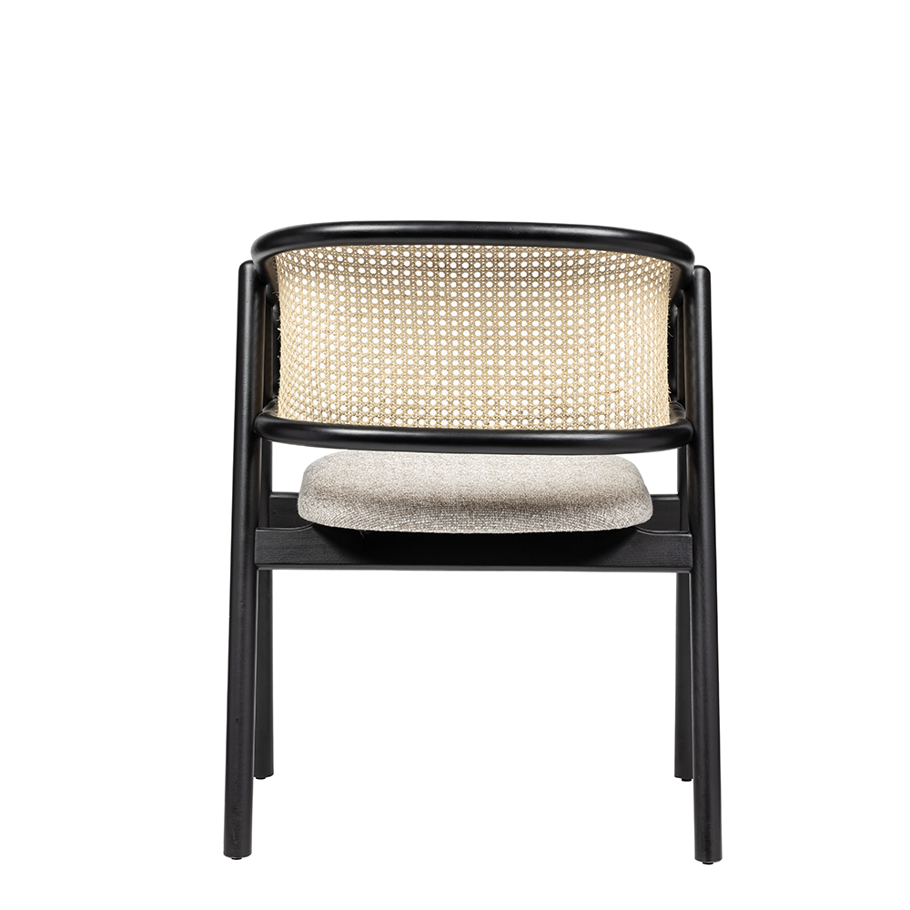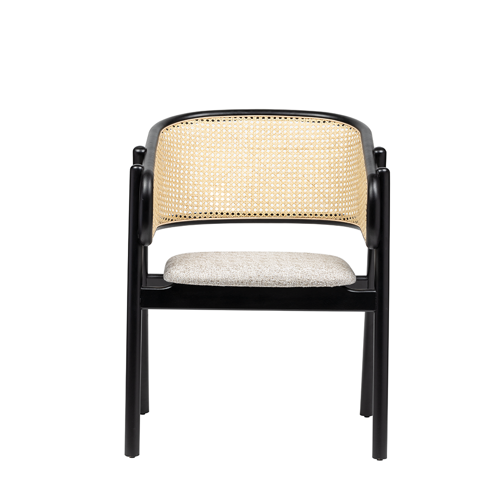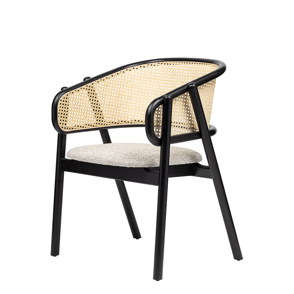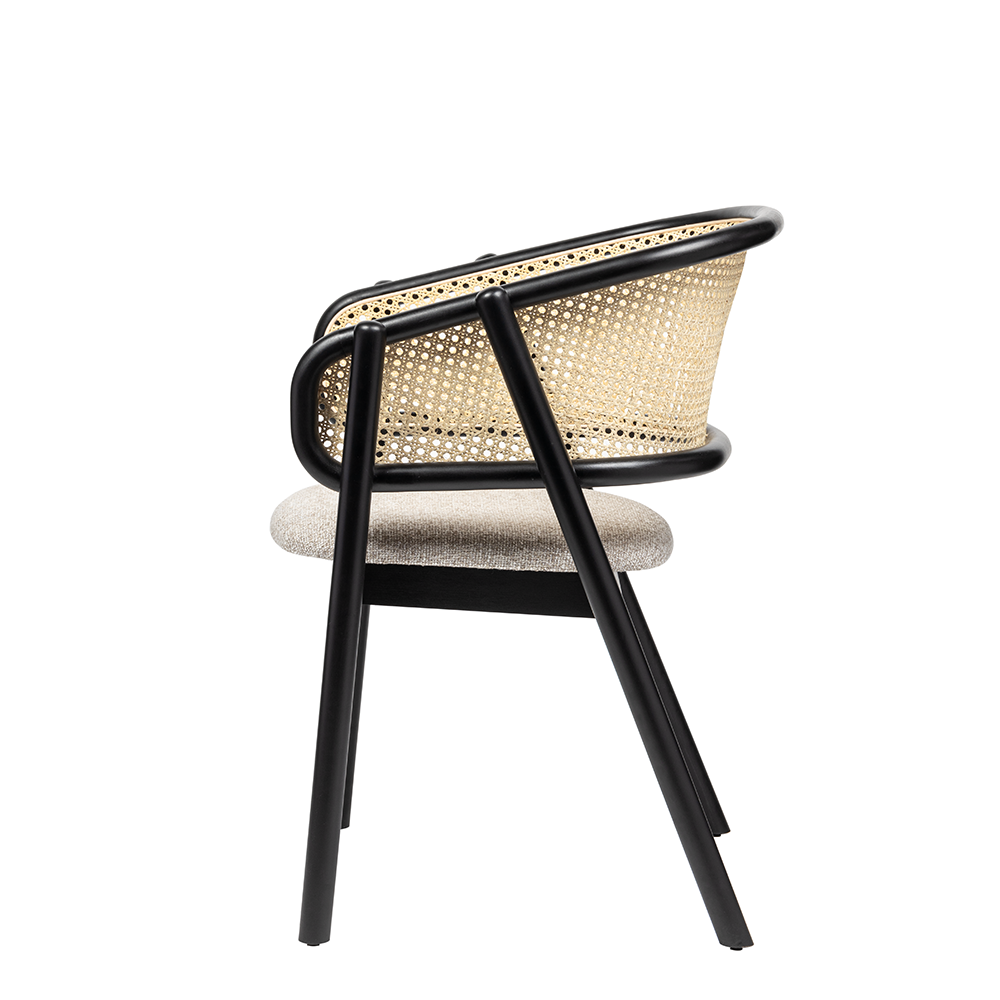 Restoran, otel ve cafe projelerinde sıkça tercih edilen bu model, hem doğal hasır dokusuyla rustik bir hava yaratır hem de siyah iskelet formuyla modern mekânlarda güçlü bir karakter sergiler.