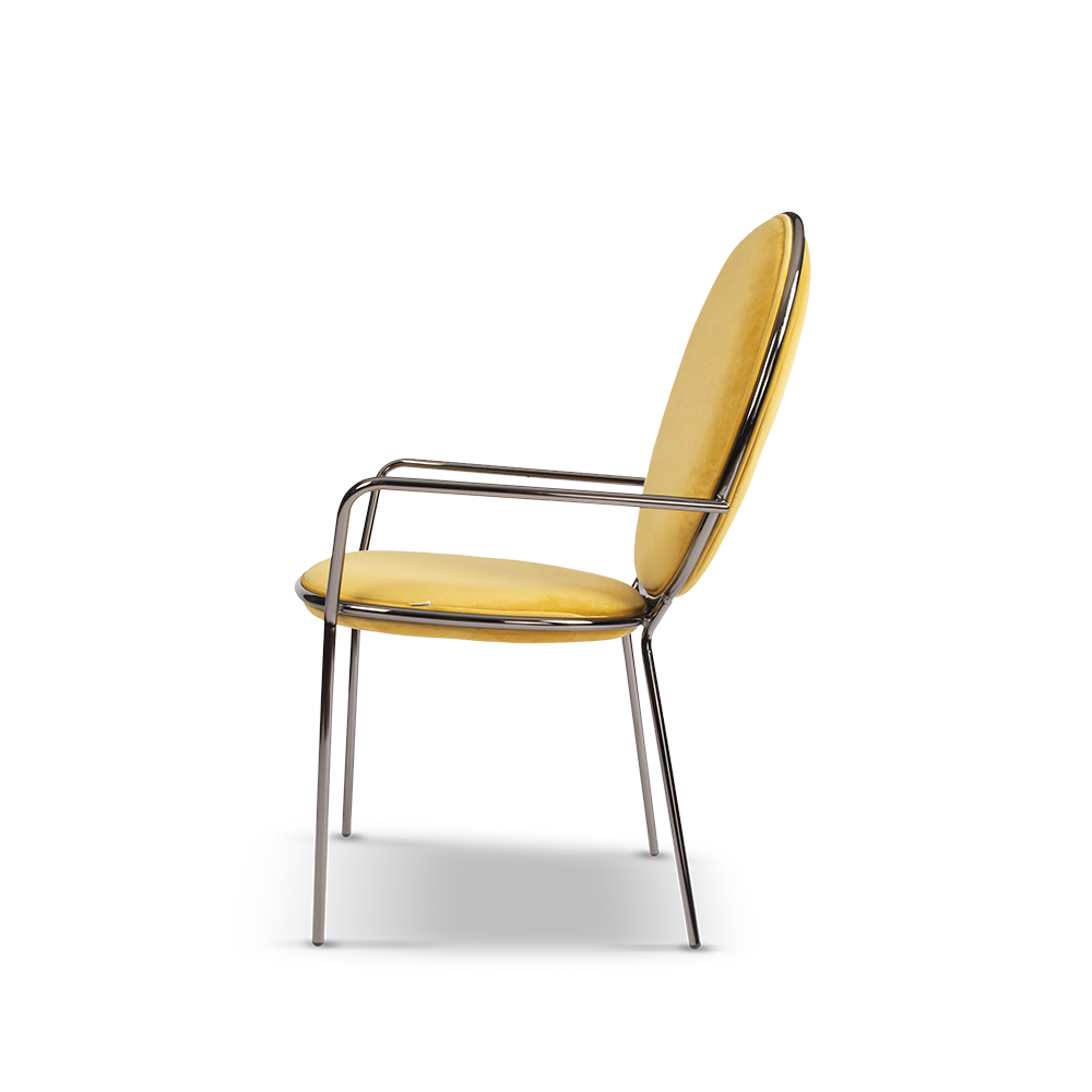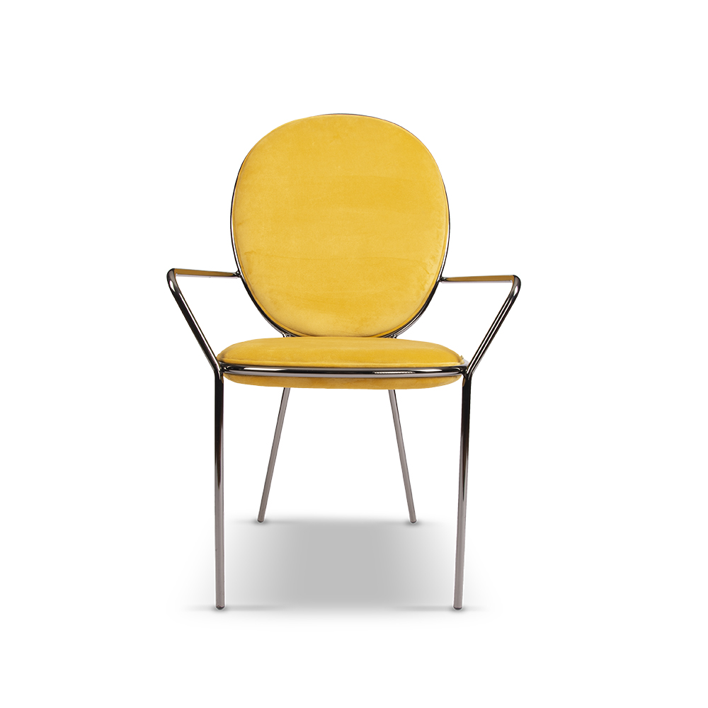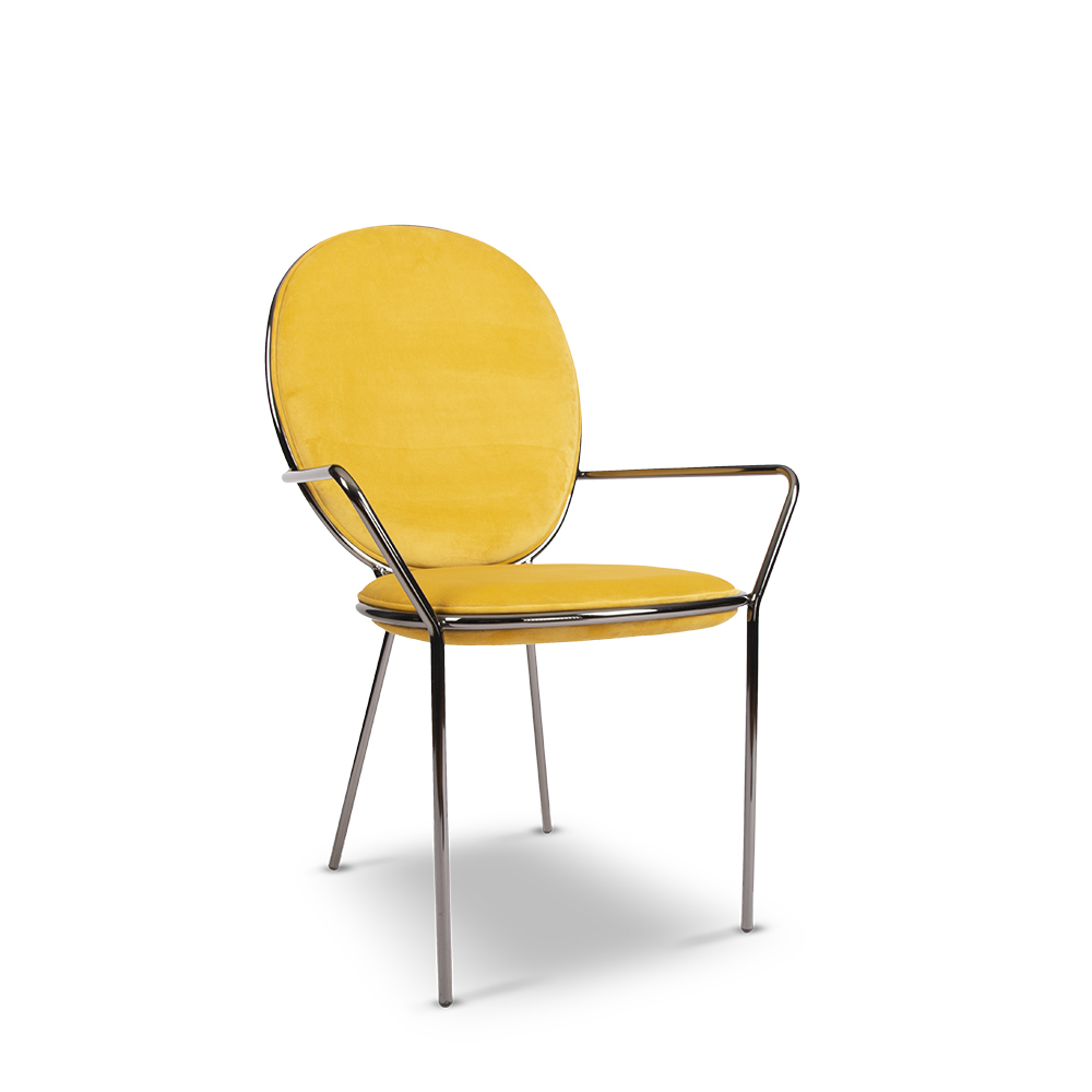 Sole restoran sandalyesi, zarif formu ve enerji veren rengiyle modern mekanlara canlılık katmak için tasarlandı. Parlak krom ayak yapısı, ince metal kollar ve dairesel oturum formu sayesinde hem estetik hem de ergonomik bir oturum deneyimi sunar.