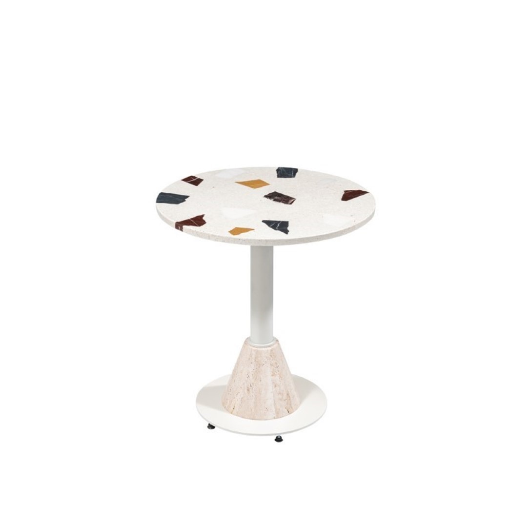 Terrazzo Desenli Modern Yuvarlak Masa, çok renkli terrazzo görünümlü yuvarlak tabla ve açık tonlu konik ayak tasarımı ile dikkat çeker. Modern dekorasyonlu cafeler ve restoranlar için ideal bir seçenektir. Kolay temizlenebilir yapısı ve özgün tasarımı sayesinde mekanlara dinamik bir hava katar.