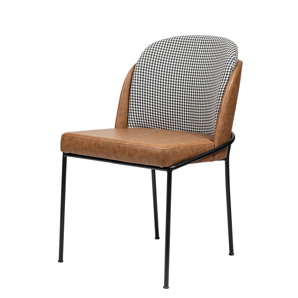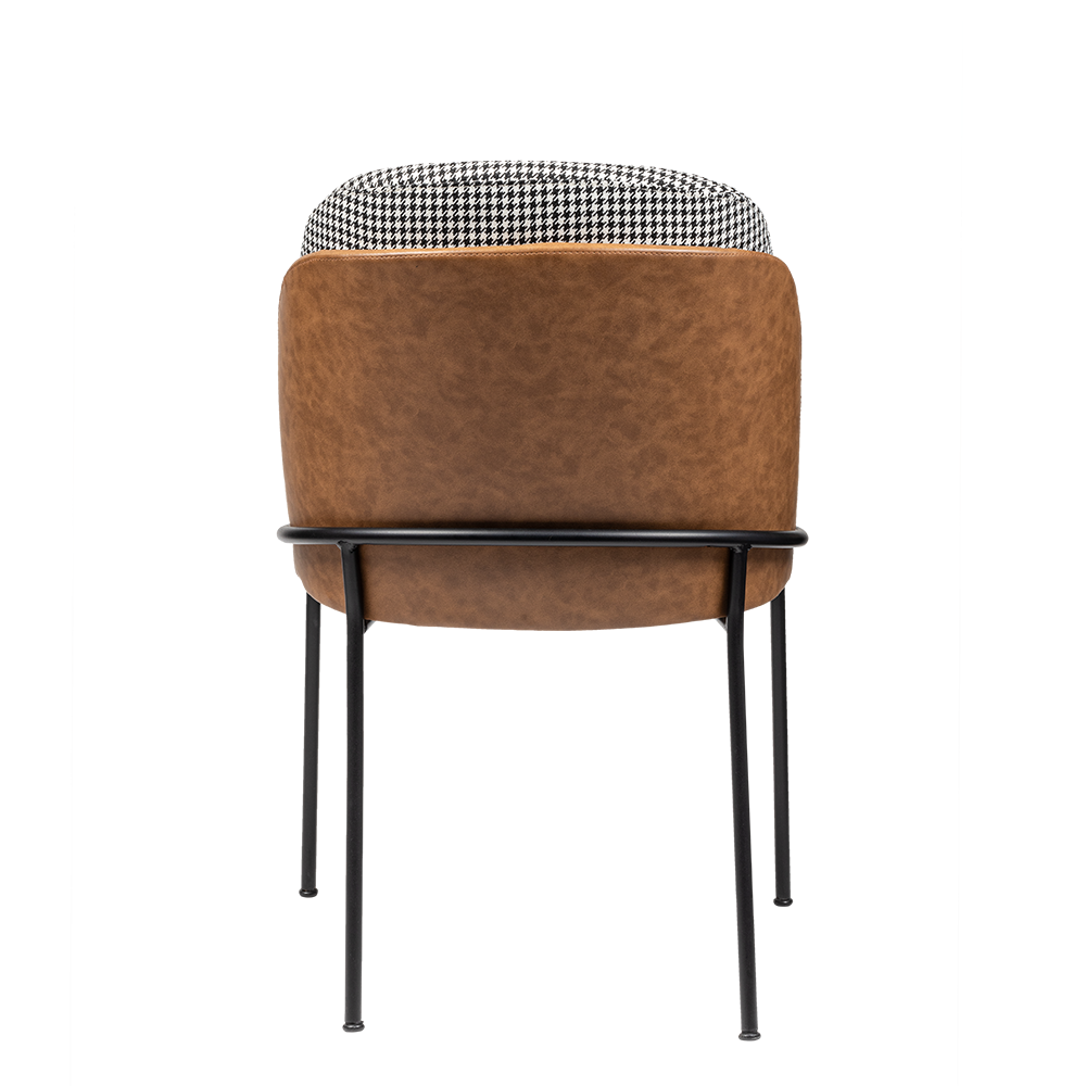 Ubbe İç Mekan Sandalyesi, modern mekânlara retro bir dokunuş katmak isteyenler için tasarlandı. Arka sırt kısmında kullanılan siyah-beyaz kazayağı desenli kumaş, oturumda tercih edilen sıcak kahve tonlu deriyle mükemmel bir denge oluşturur. Metal iskelet yapısı, sade çizgileri ve zarif formu ile hem estetik hem de işlevselliği bir araya getirir.