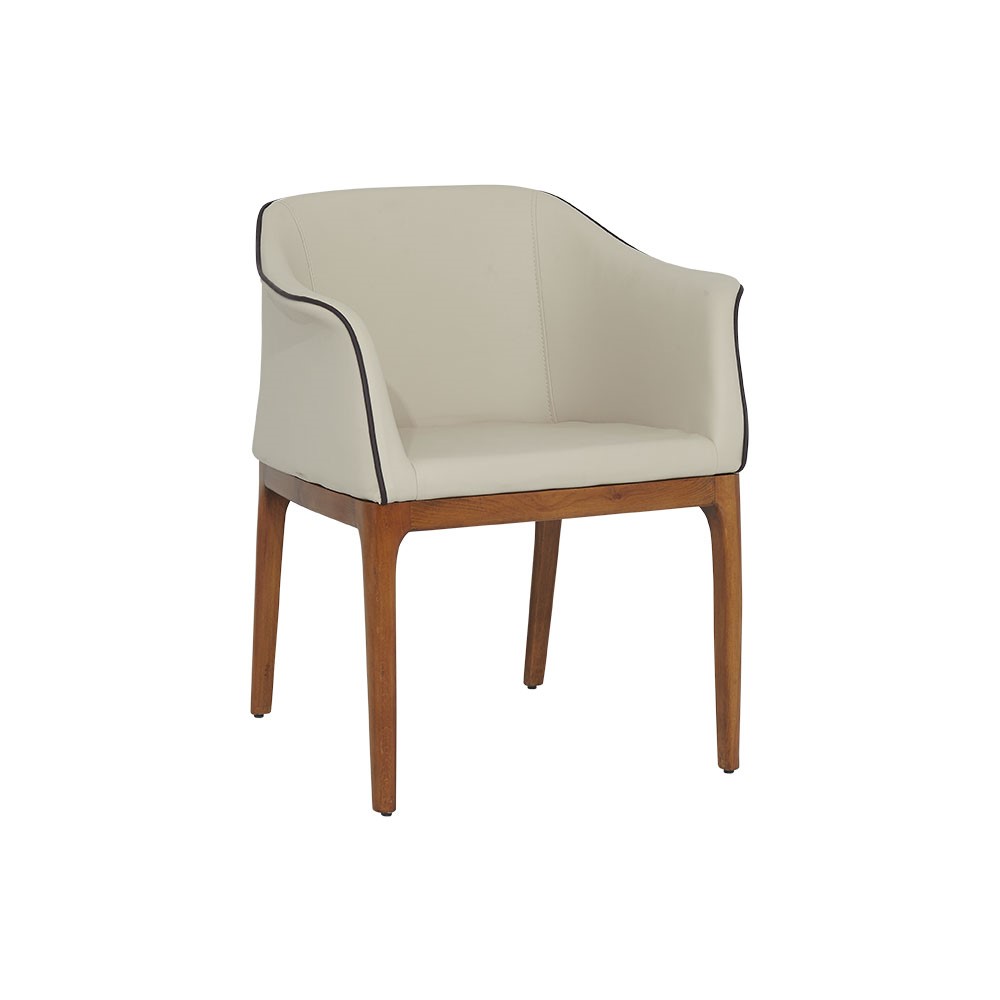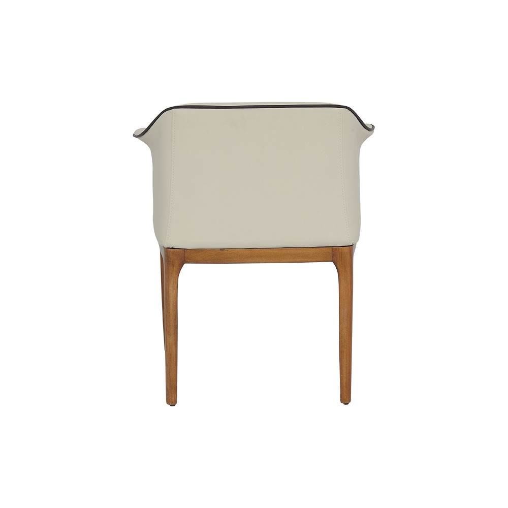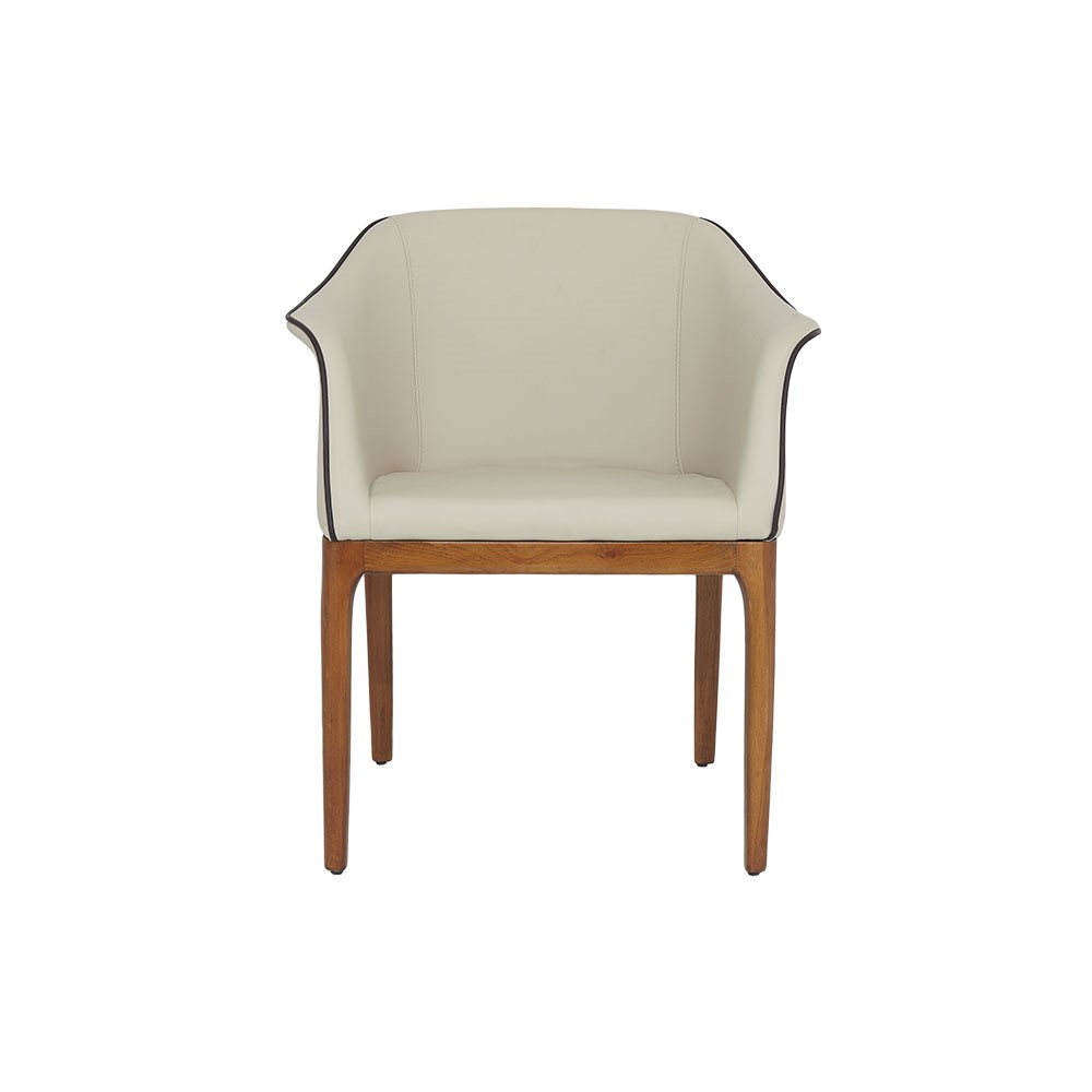 Uno İç Mekan Sandalyesi, yalın zarafetiyle öne çıkan, konforu estetikle birleştiren bir modeldir. Ahşap ayak yapısının sıcak tonları, açık krem deri döşemeyle birleşerek dengeli ve ferah bir görünüm oluşturur. Sırt ve kol bölgesindeki siyah biye detayı, tasarıma ince bir kontrast katarak modern bir vurgu yaratır.