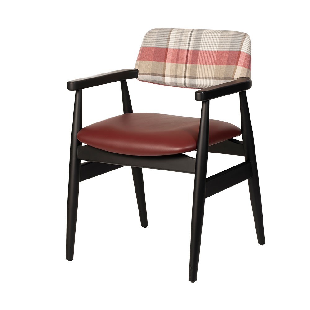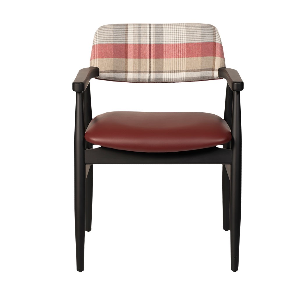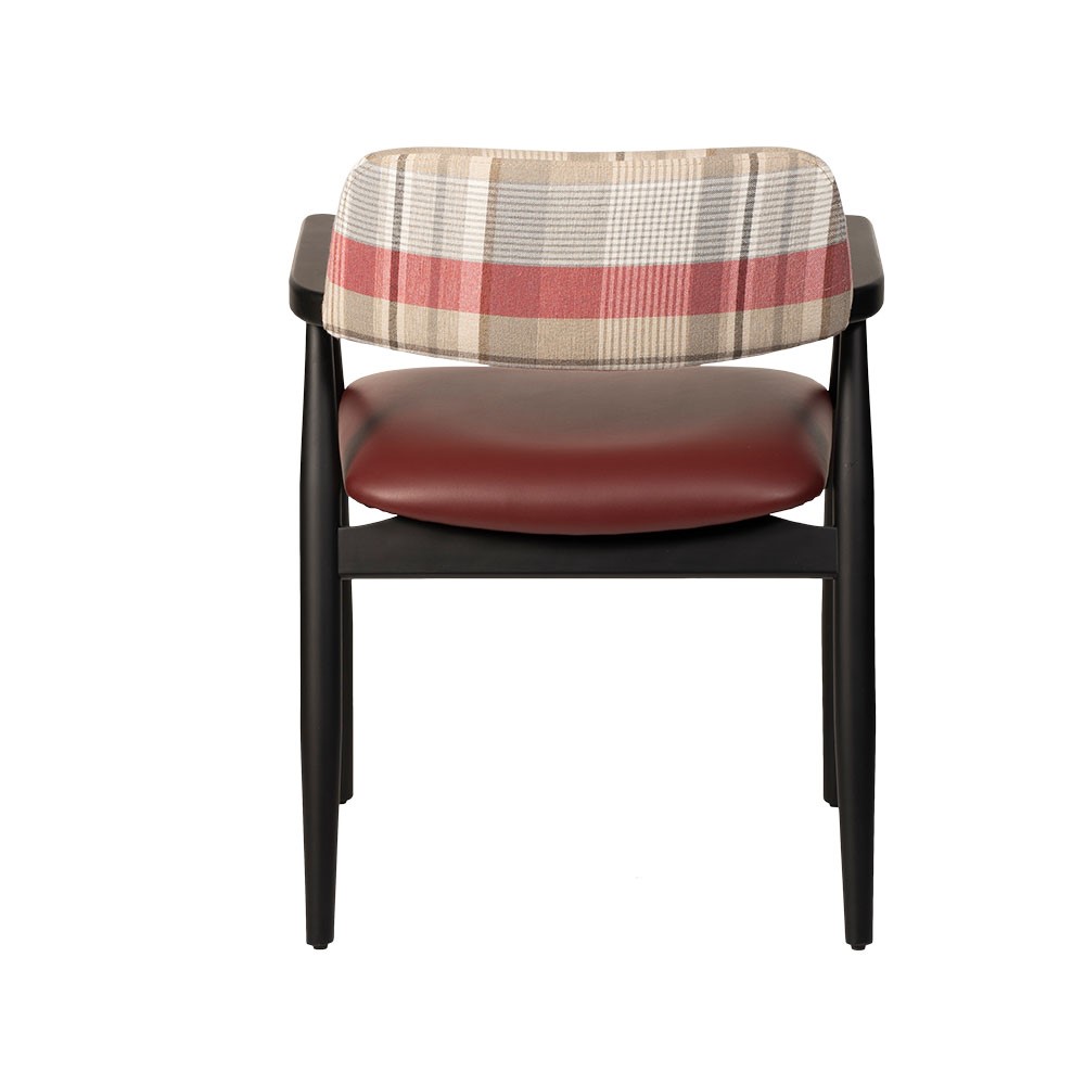 Zeus İç Mekan Sandalyesi, retro dokulu kumaşı ve doğal ahşap iskeletiyle sıcak, davetkâr bir atmosfer yaratır. Sırt kısmında kullanılan kareli kumaş detayı, tasarıma nostaljik bir karakter kazandırırken; bordo deri oturum kısmı modernliği ve konforu bir arada sunar.